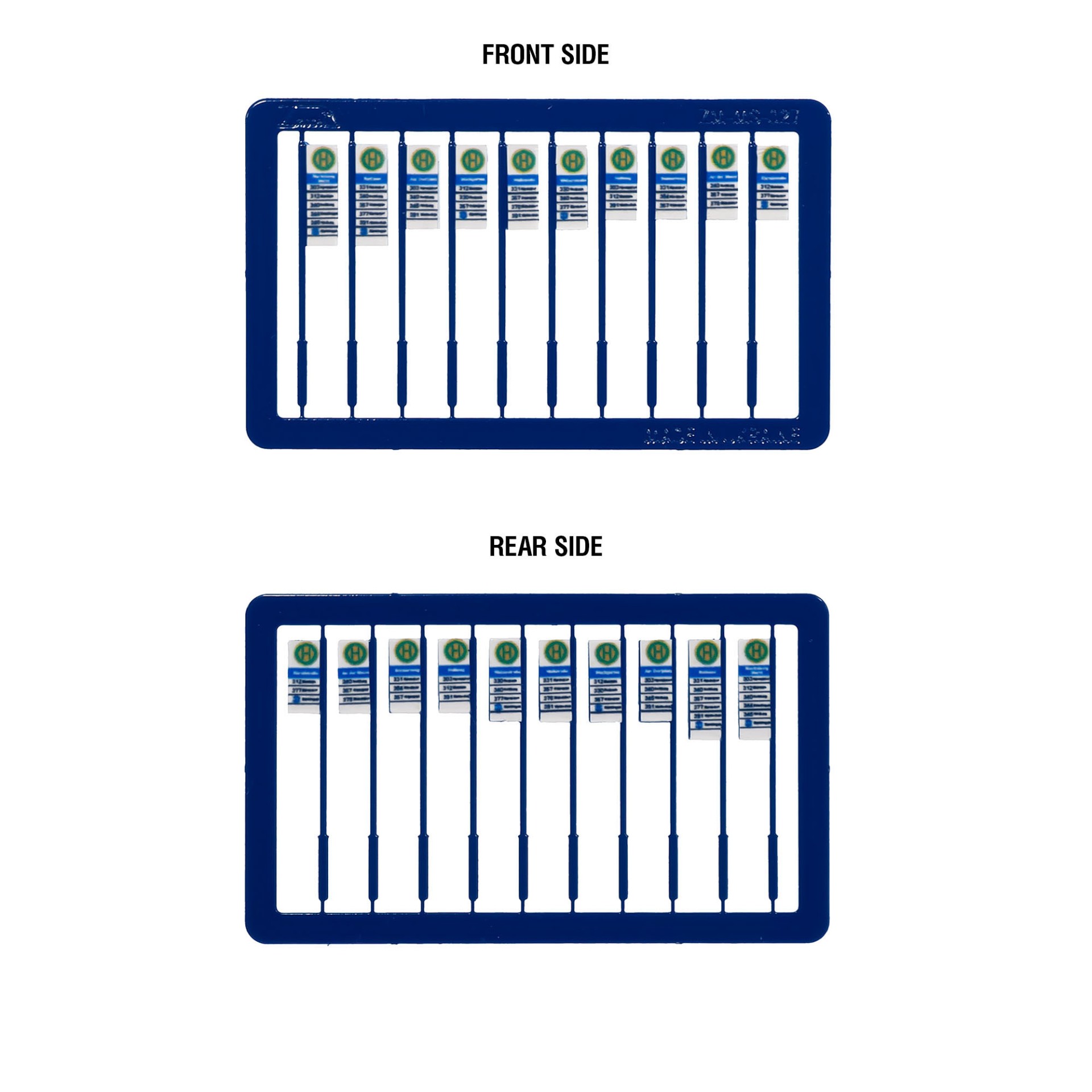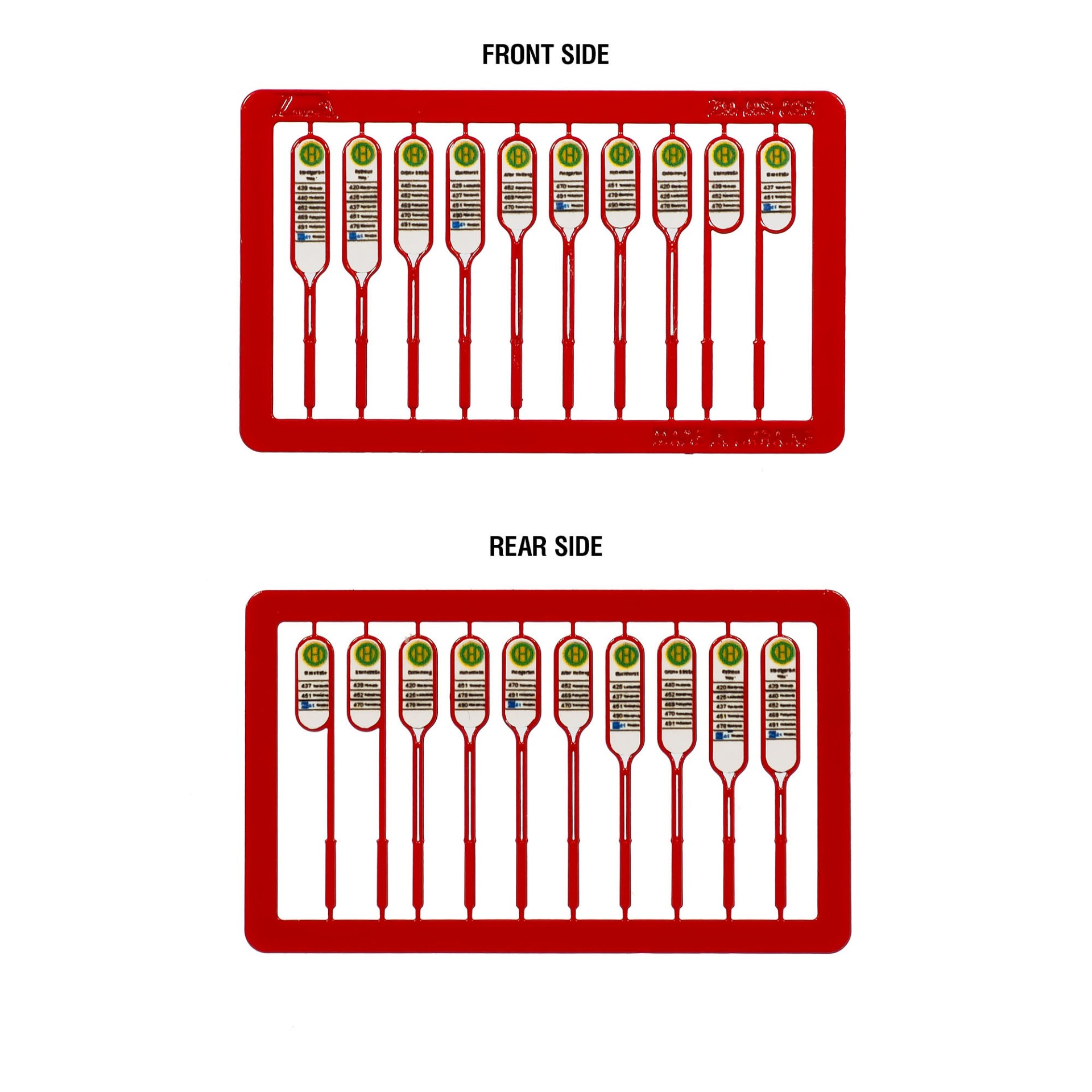 The signs are made of 0.3 mm photo etched nicker silver with half-etched elements. I meticulously designed each single sign with its own unique bus stop names. Plastic laser printed labels are manually attached to both sides of the sign. Each set consists of 10 signs and 3 or 4 different heights (according to a different number of bus routes):