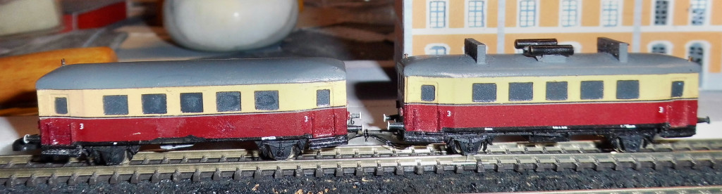 Ein Gespann mit Beiwagen einer Privatbahn der DB in rot mit der Nr. 43307.4 und ein anderer Triebwagen mit Beiwagen der DRG in blau-beige mit der Nr. 42308.3 wurde auch produziert.