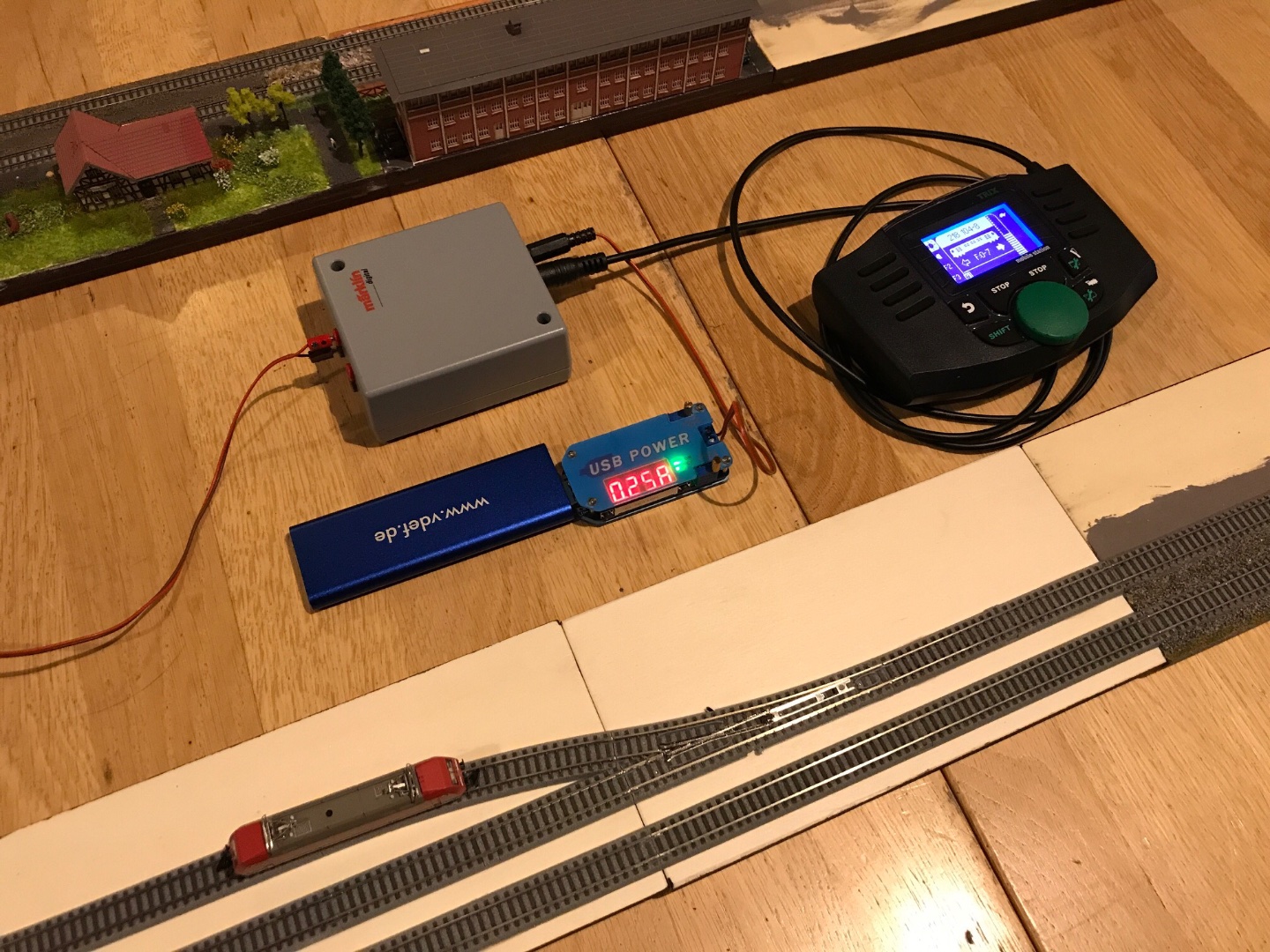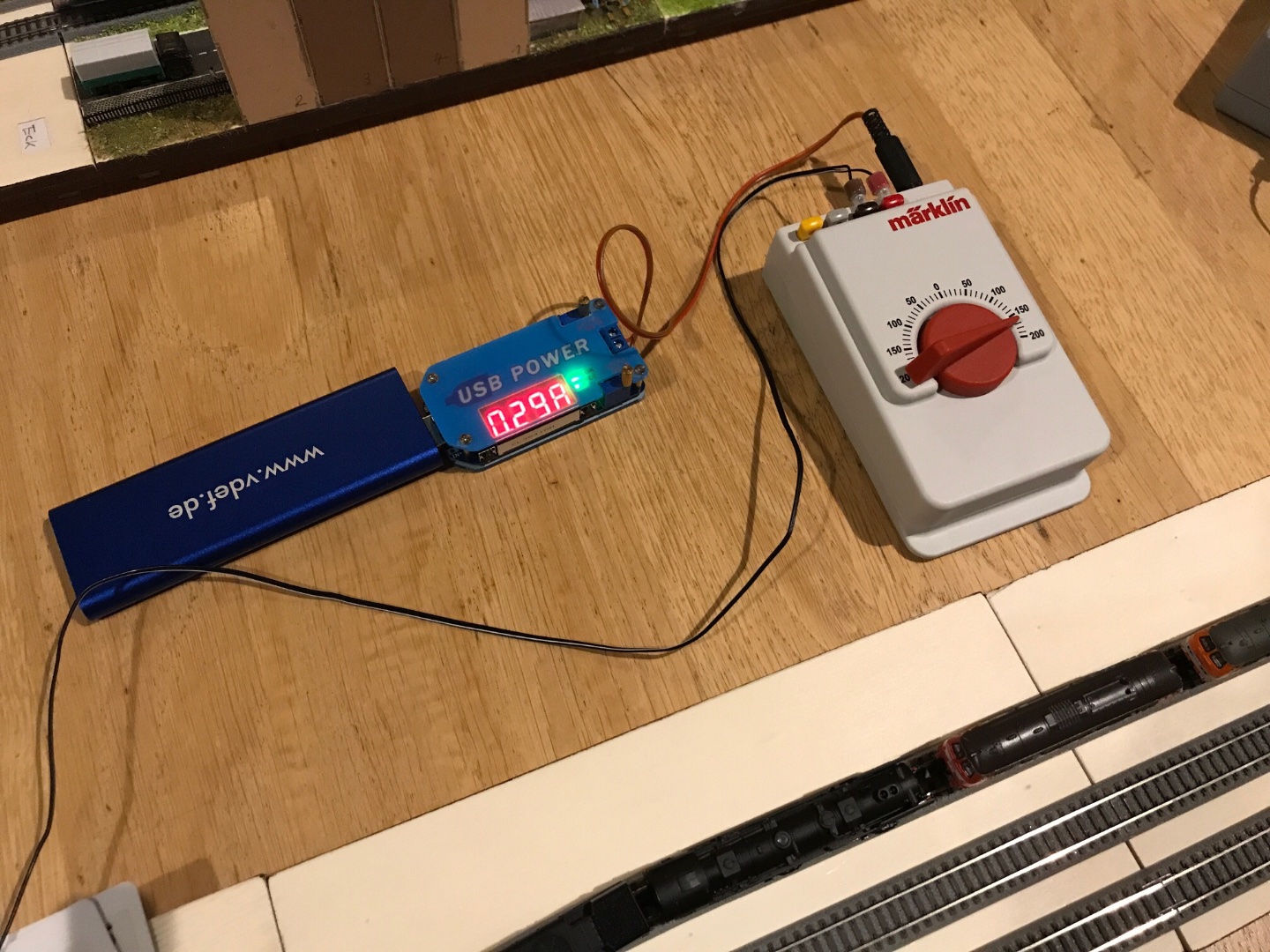 Die abgebildete Powerbank liefert max. 1 A Strom. Das reicht für 2 bis 3 Digitalloks (5 V x 1 A = 5 W und 5 W / 12 V = 0,4 A). Die Gleisbox mit einer Mobilstation ohne Lok braucht 0,06 A laut Anzeige.