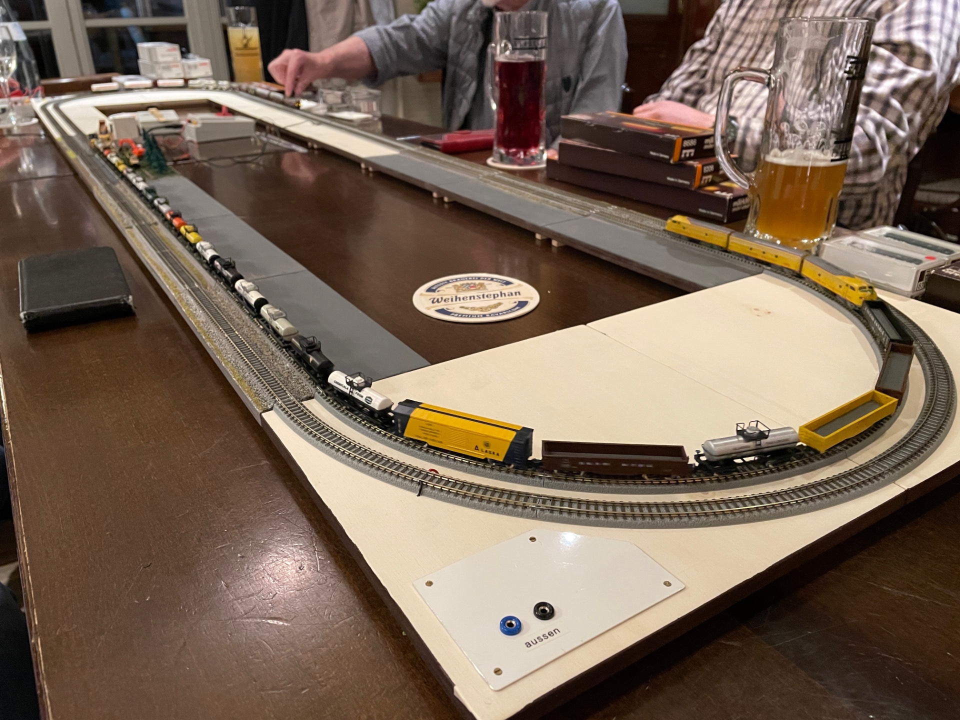 Wir bringen unsere Brettlesanlage mit, auf der analoge und digitale Loks fahren gelassen werden können. Das sieht dann zum Beispiel so aus: Bis morgen