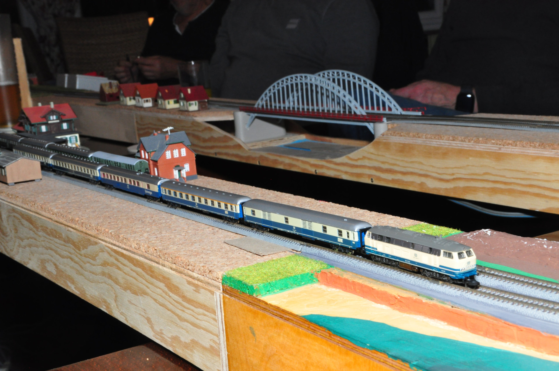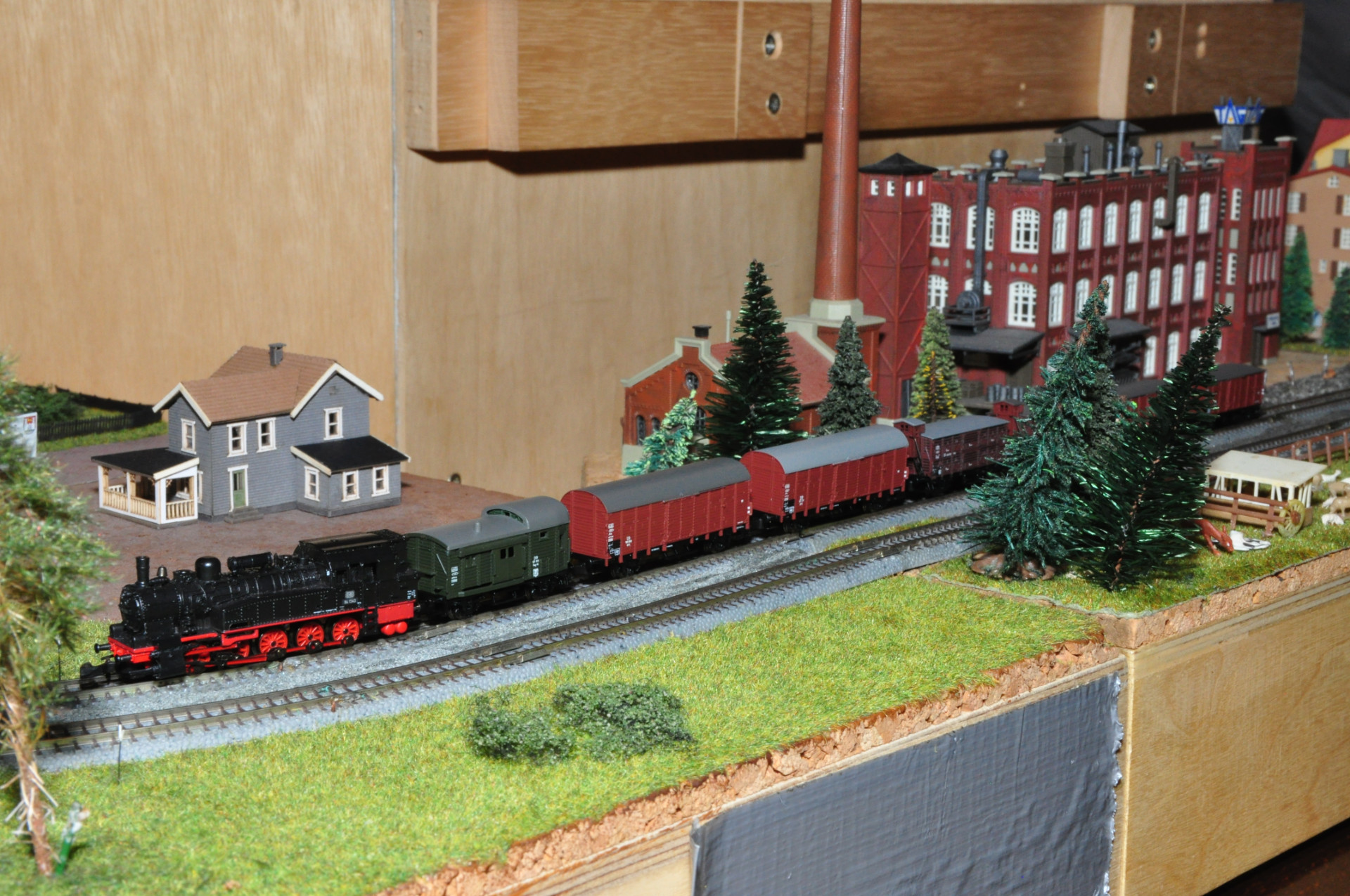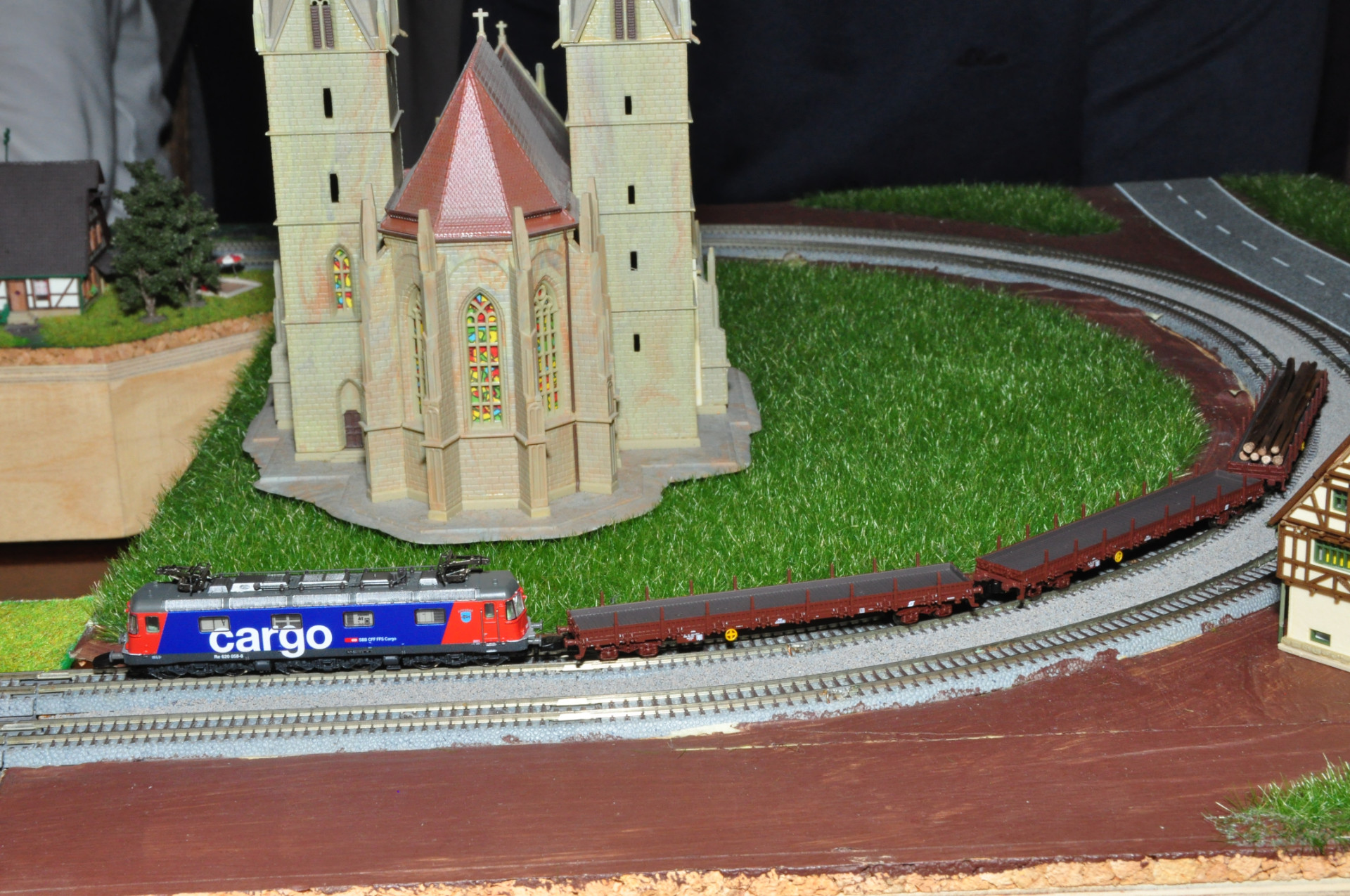 Wenn man von vorne auf die Anlage schaut, sieht man "das Loch" nicht. Ein Tunnelportal wäre dort einfach nur falsch und eine bessere Lösung als ein möglichst kleines Loch mit Tarnung zur Front hin ist uns bisher nicht eingefallen... evtl. noch so ein Vorhang wie beim Flughafen des Miniaturwunderland... aber wenn man es in Natura sieht wäre der Aufwand übertrieben.