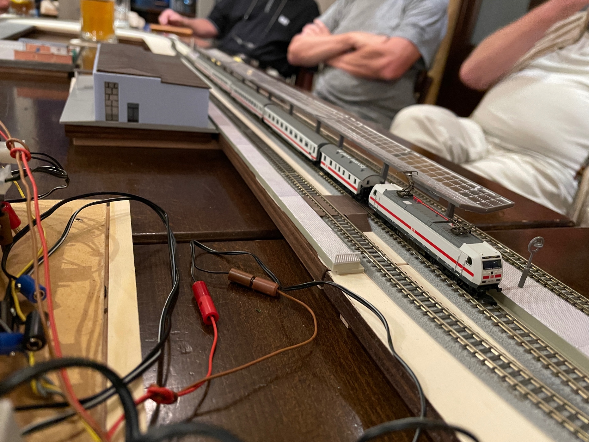wenn Thomas dabei gewesen wäre, hätten wir noch einen Tisch mehr anbauen müssen und hätten dann fast in den Wintergartensaal hineingeragt, denn heute waren wir eine große Runde. Auf der Brettlesbahn kreisten heute kugelgelagerte Radstromabnehmer und eine IC-Garnitur mit Extrawagen für die 9-€-Ticketinhaber, die Gesprächsthemen waren sehr vielfältig: vom Sonnenblumen einpflanzen, Hintergründe, Oberleitungsbau, Bezugsquellen für Digitaldecoder, Bahnsteigdächer. Modellimmobilien wechselten ihre Besitzer und vieles mehr.