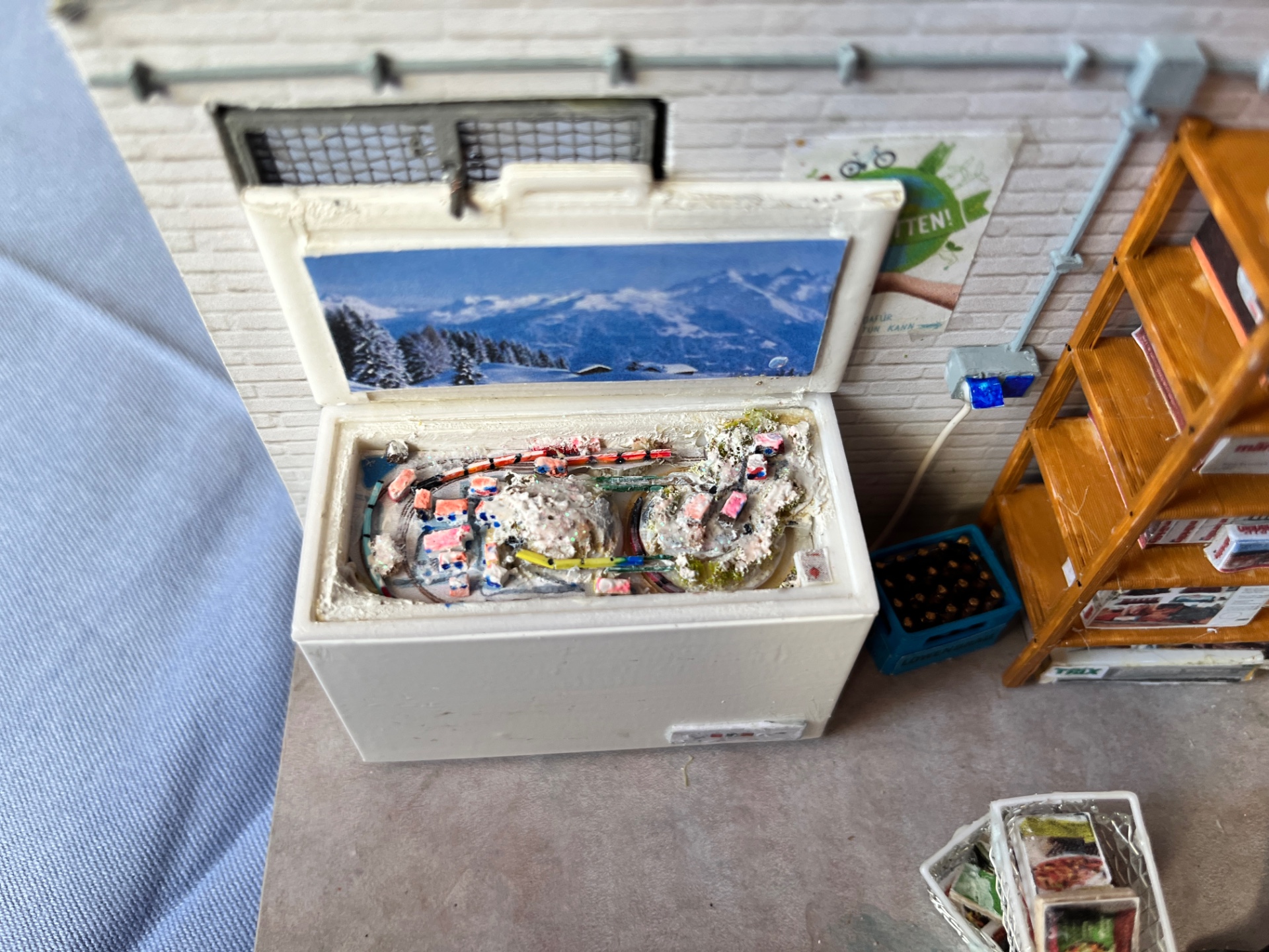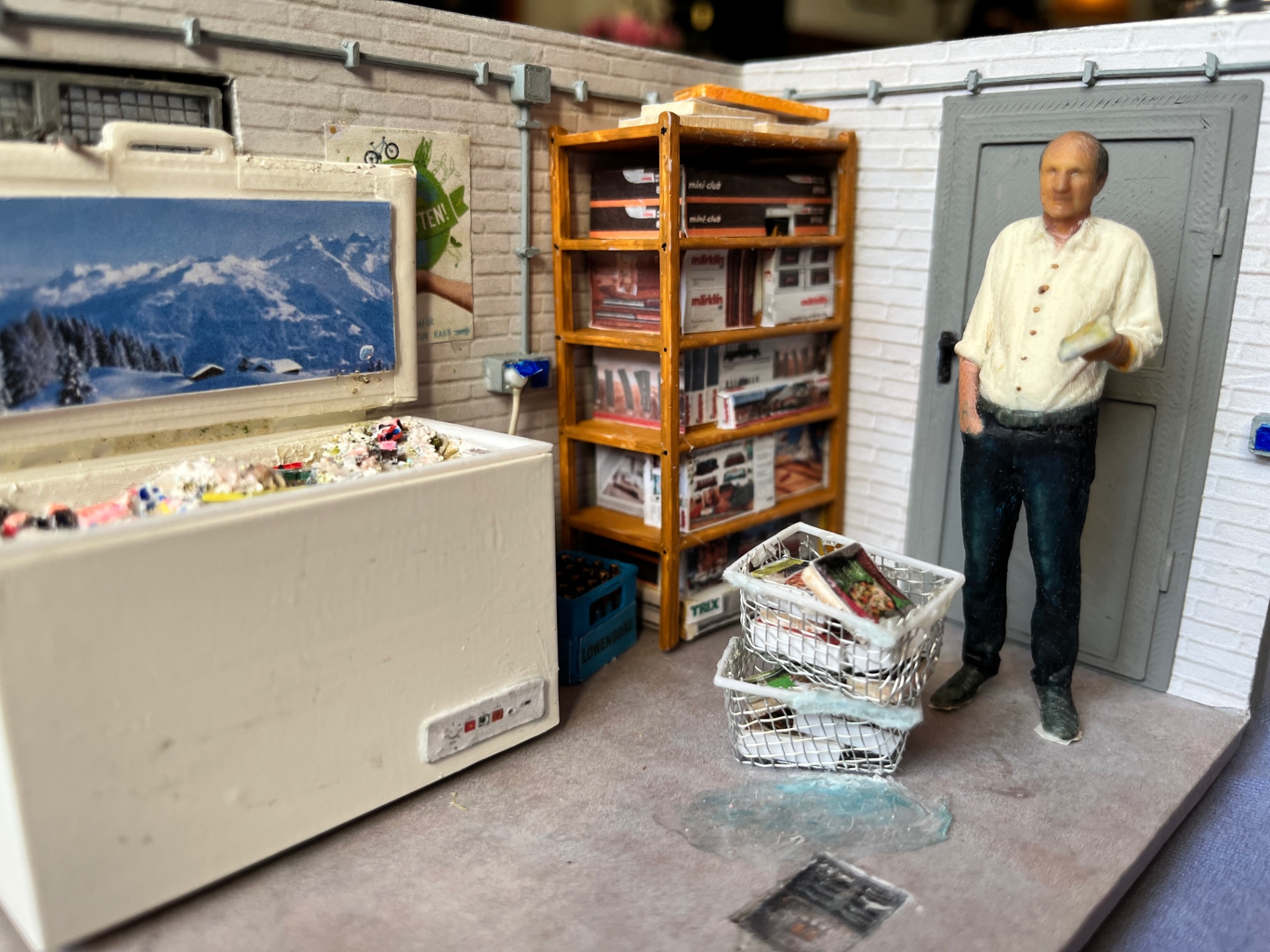 Werner, Du musst das auch so sehen: hinten an der Kellerwand das Plakat "Rettet die Welt" (globale Erwärmung) und davor die MoBa in der Kühltruhe, während die Tiefkühlkost davor liegt und auftaut - Nein ich interpretiere nichts hinein, das wurde mir von Erwin Kohout so geschildert.