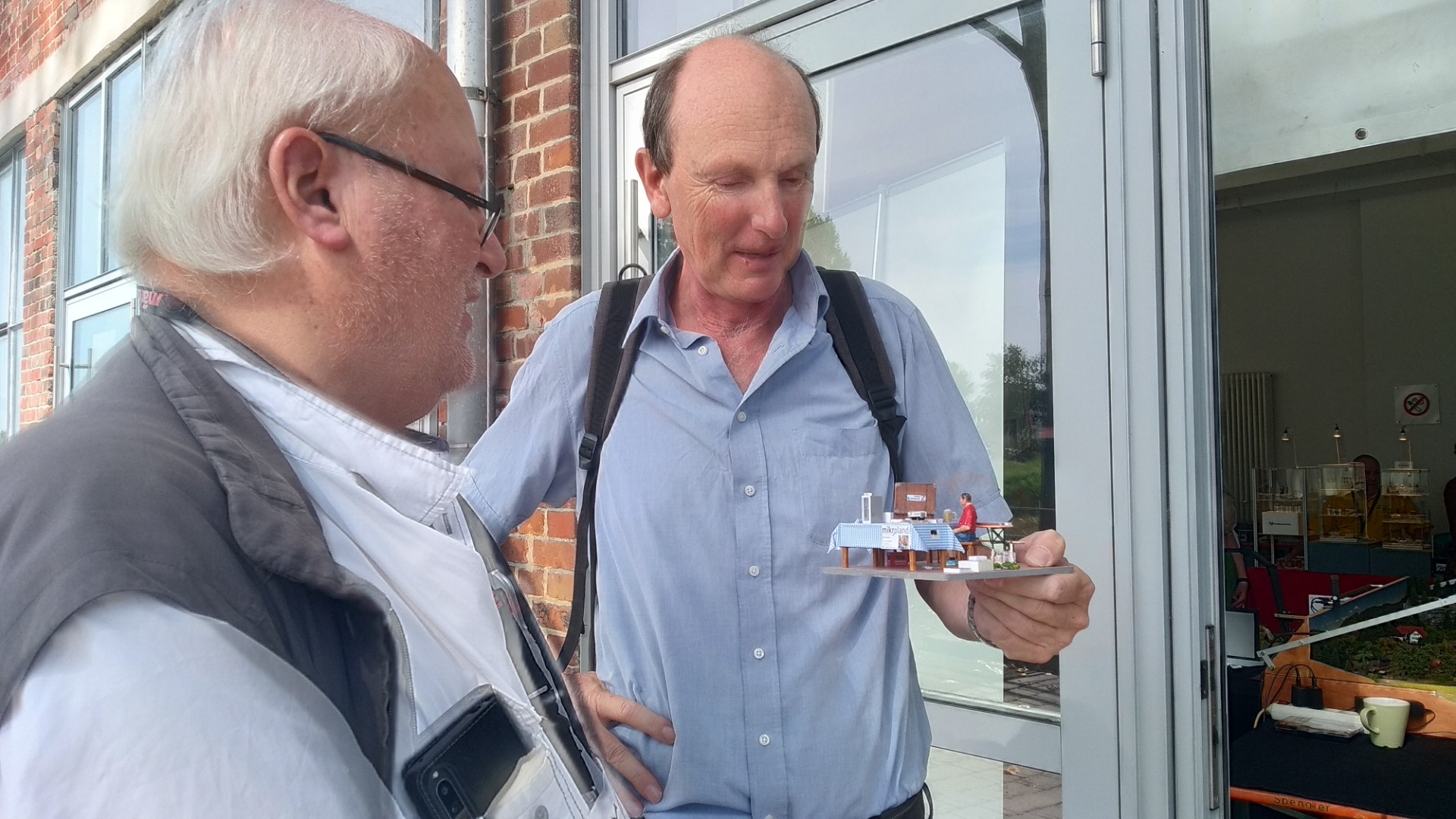 An dem Tisch an dem ich saß fand sich ein kleine Szene in der man sieht, wie Man(n) seine Modellbahn vor der Ehefrau versteckt
