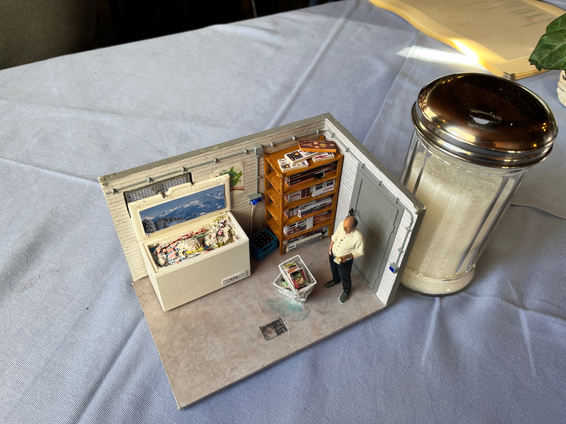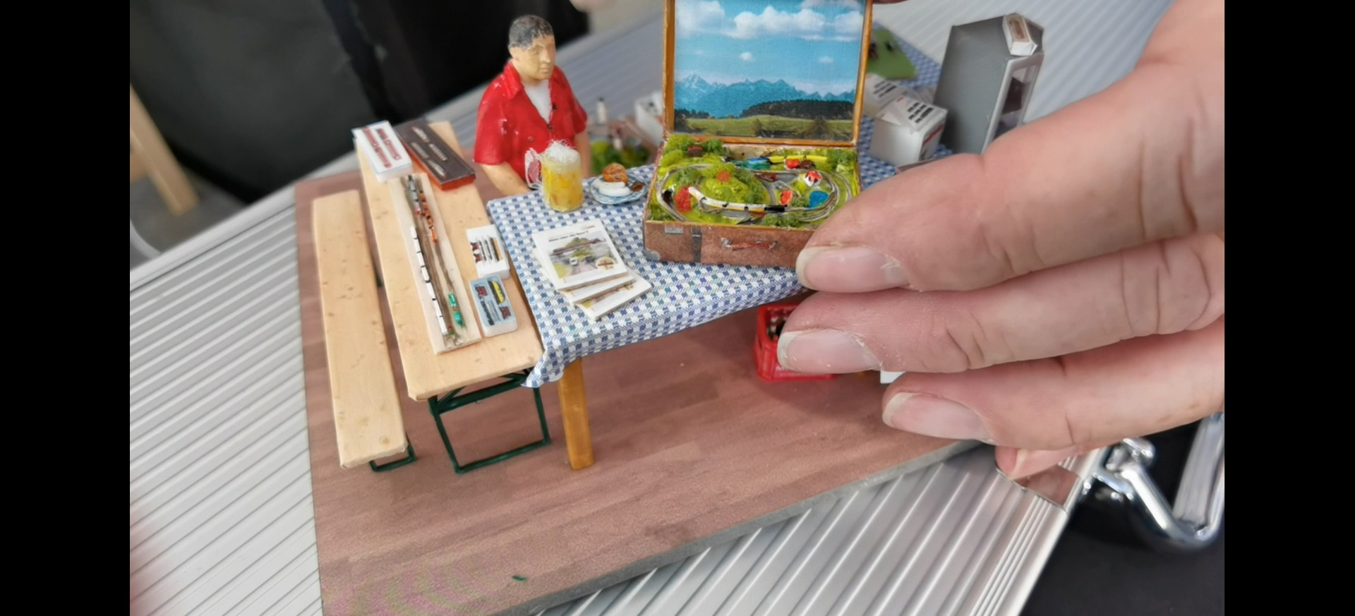 An dem Tisch an dem ich saß fand sich ein kleine Szene in der man sieht, wie Man(n) seine Modellbahn vor der Ehefrau versteckt