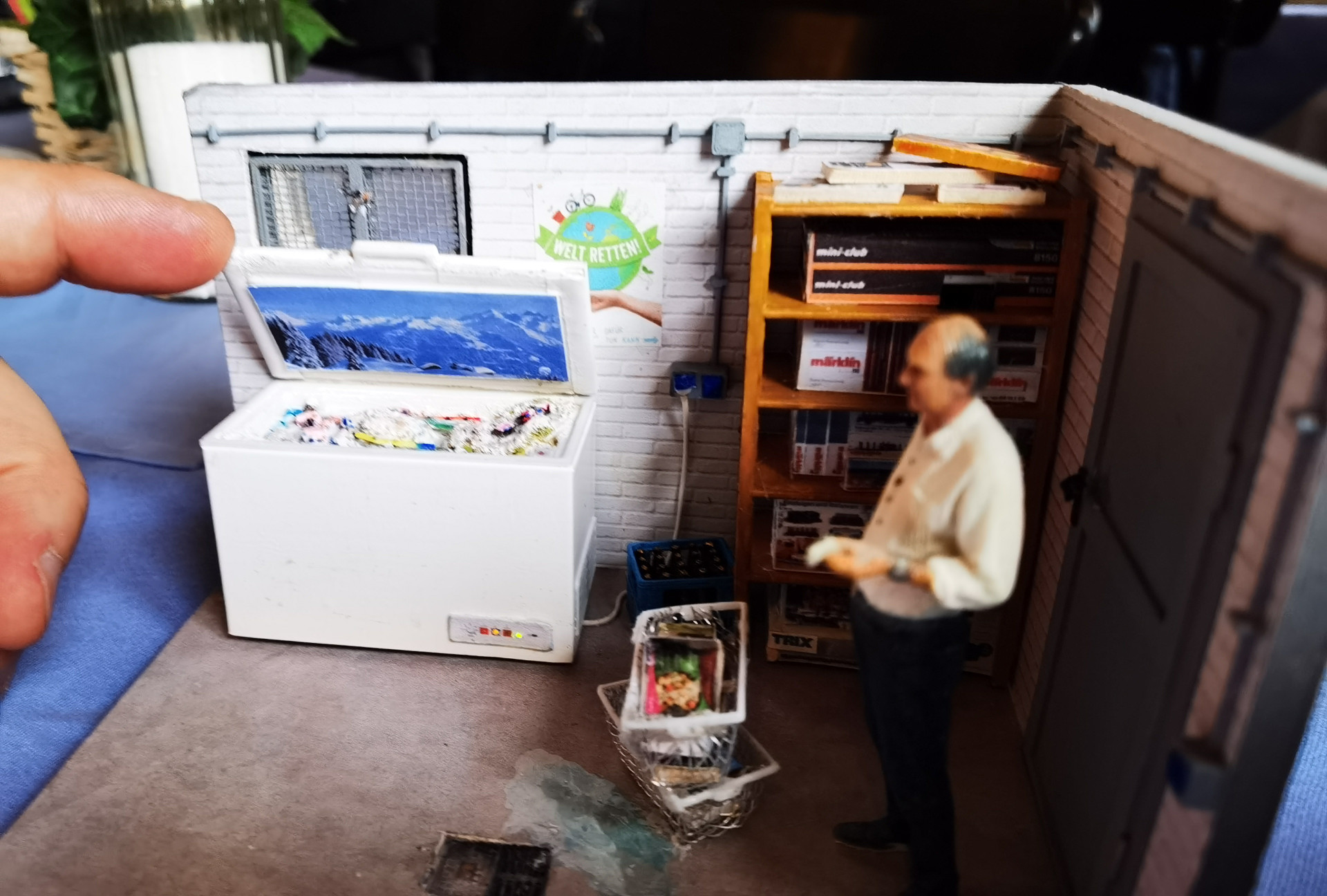 Werner, Du musst das auch so sehen: hinten an der Kellerwand das Plakat "Rettet die Welt" (globale Erwärmung) und davor die MoBa in der Kühltruhe, während die Tiefkühlkost davor liegt und auftaut - Nein ich interpretiere nichts hinein, das wurde mir von Erwin Kohout so geschildert.