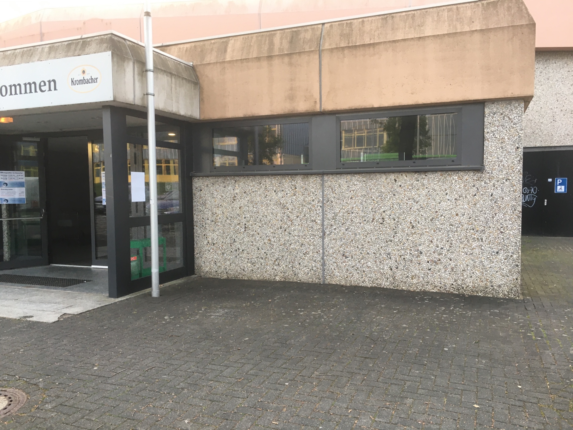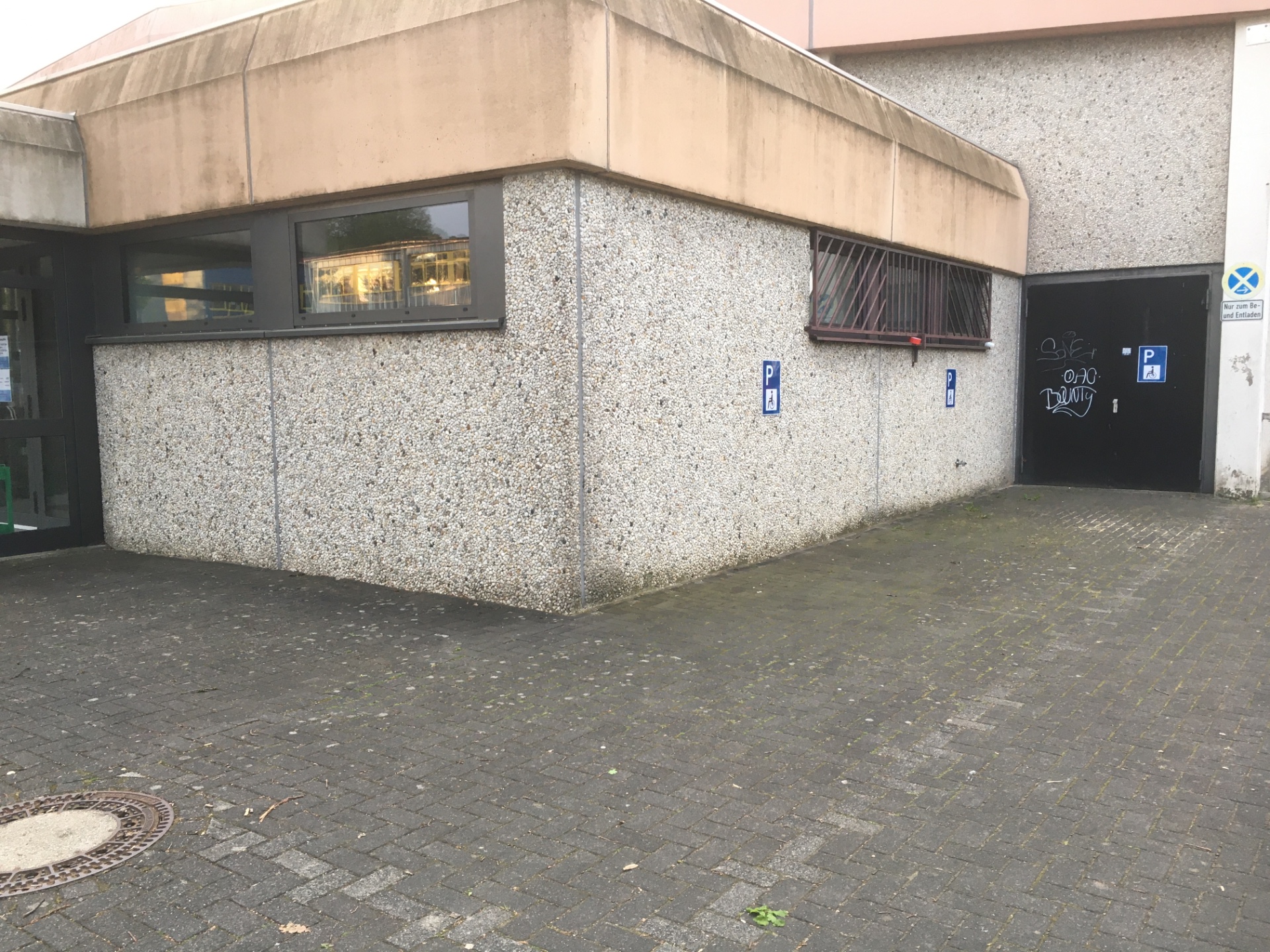Für Menschen mit Behinderung haben wir ein bis zwei Parkplätze rechts neben dem Haupteingang eingerichtet. Rechts daneben ist die Feuerwehr-Zufahrt, die bitte unbedingt freihalten!!!
