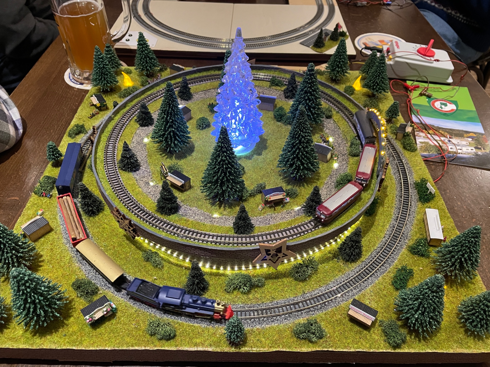 heute hatten wir wieder mal eine sehr kurzweilige Runde. Volker hatte seine neue Advents- und Weihnachtsanlage dabei, Auf der Brettlesbahn drehten ein Northlander, ein Roheisenzug, ein Schienenbus, diverse Dampfloks und ein Kohlezug ihre Runden. Auf Thomas´ Schienenkreis gab es ein Wettrennnen zwischen drei Zügen und den Vergleich zweier Turmtriebwagen.