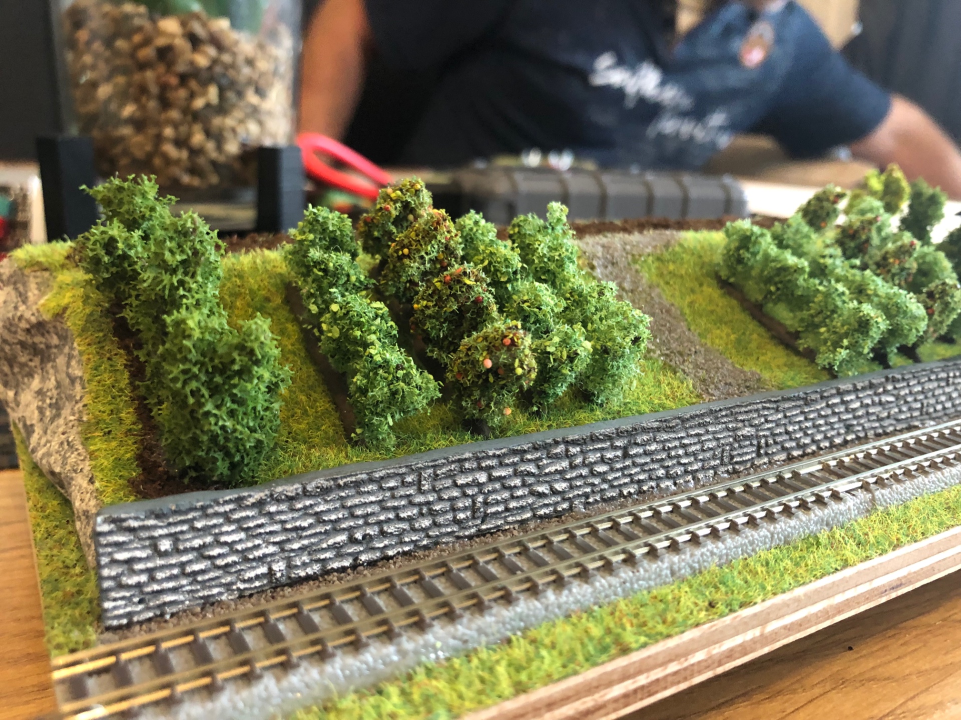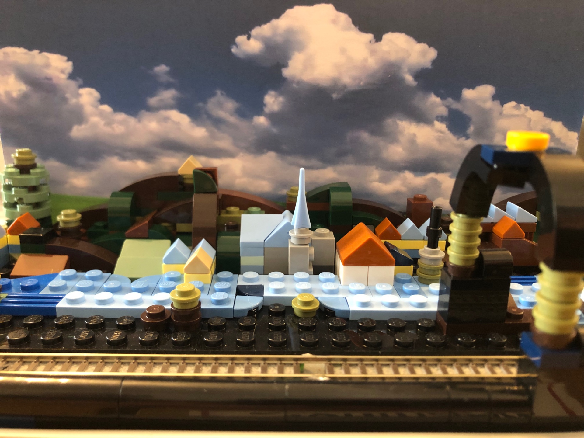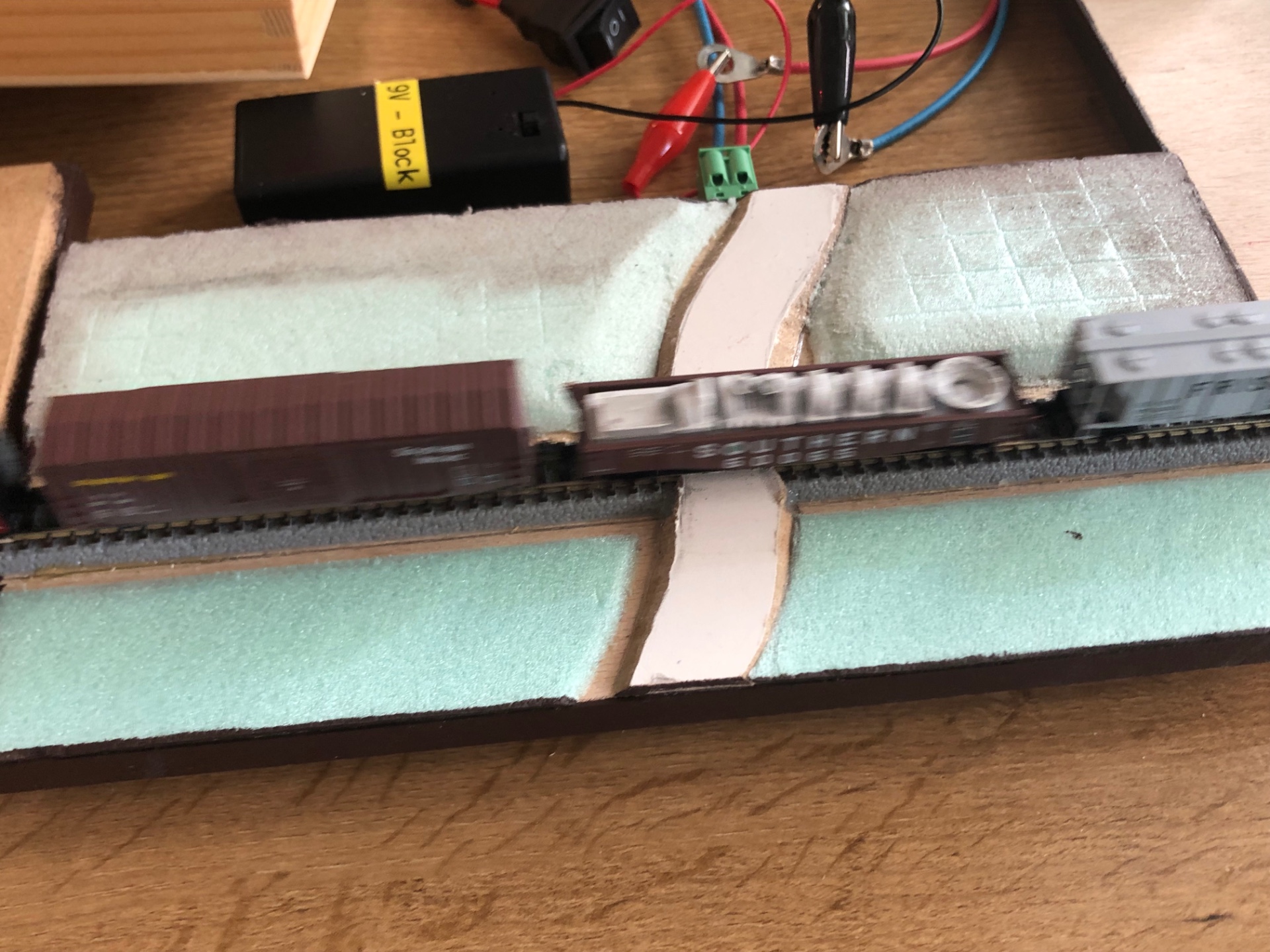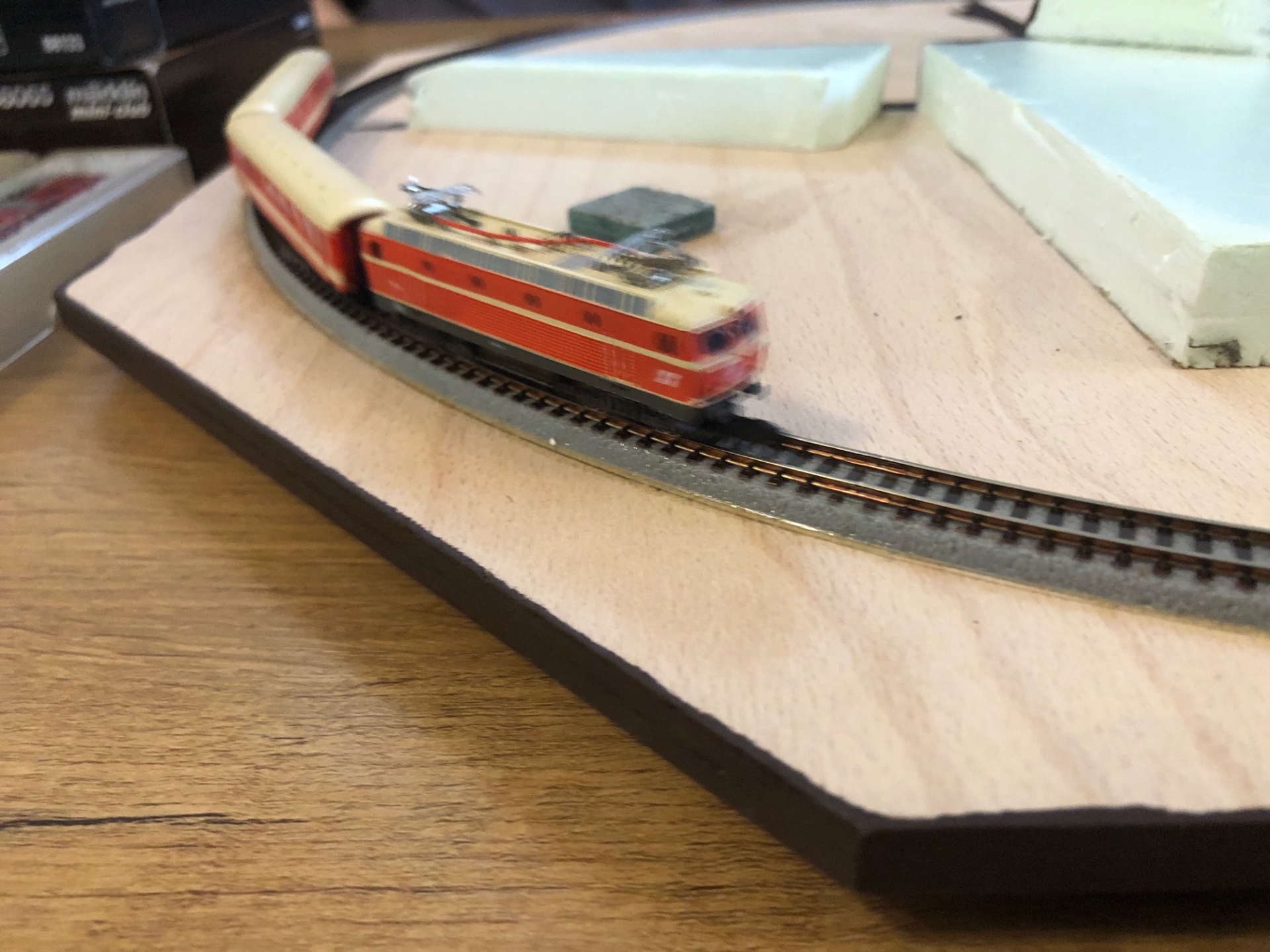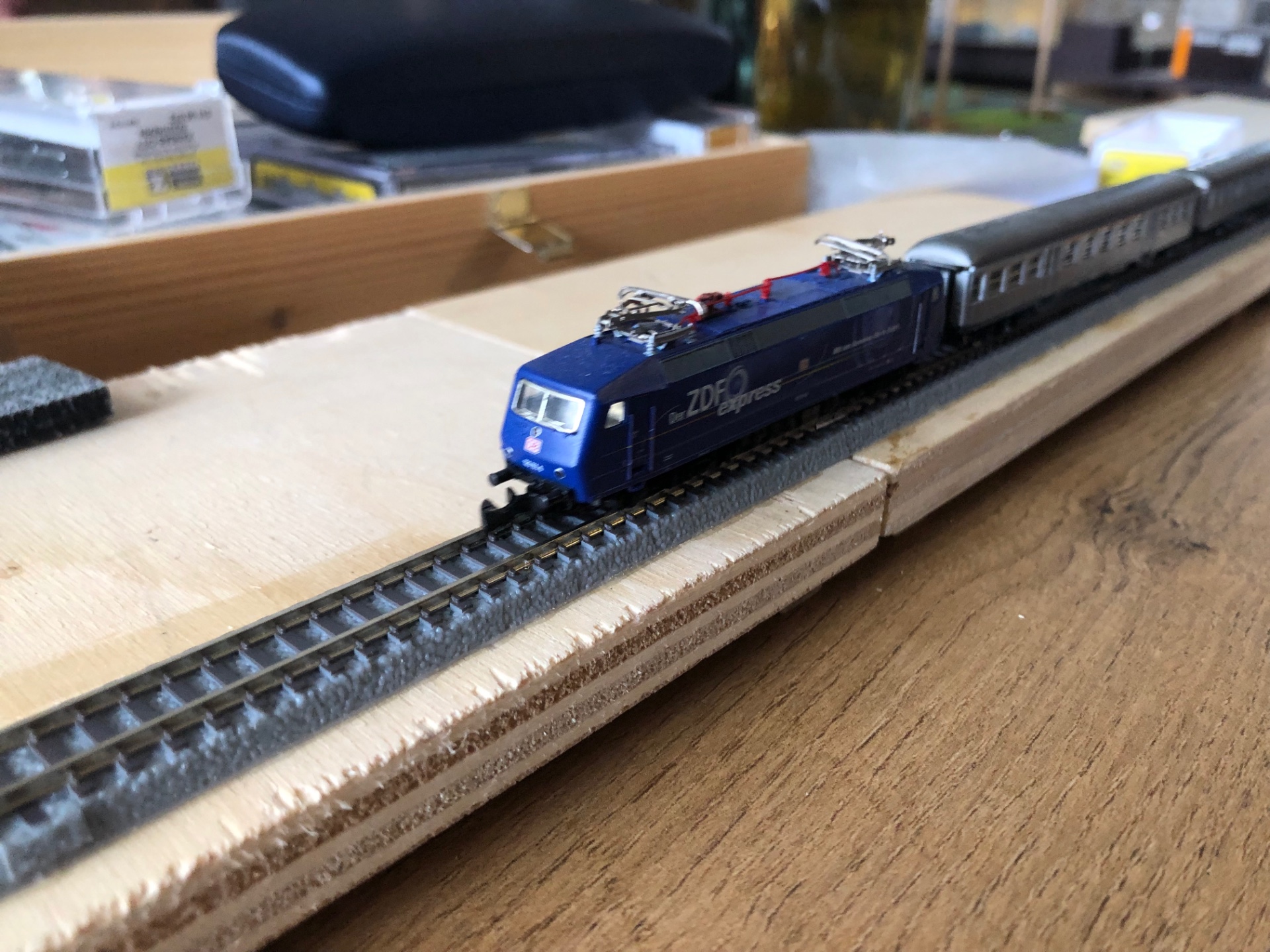 Schnell die Brettchen zusammengesteckt und schon fuhr Alex‘s ZDF 120 mit Silberlingen die Runde. Der kräftige Dreipoler der Lok verlangte aber bald einen neuen 9V Block aus dem nahegelegenen Drogeriemarkt…