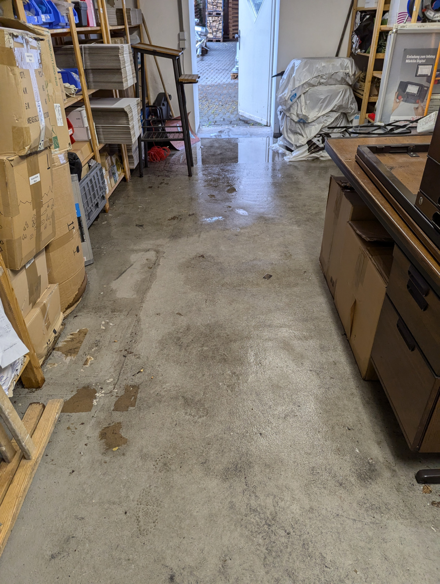 Die Rückstaudventilüberwachung im Keller piept, der Keller selbst und die akten sind aber trocken. Feuchter Boden bei den Toiletten im Keller.