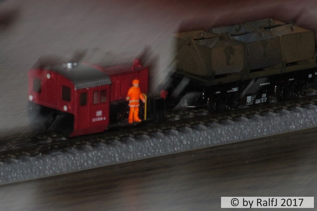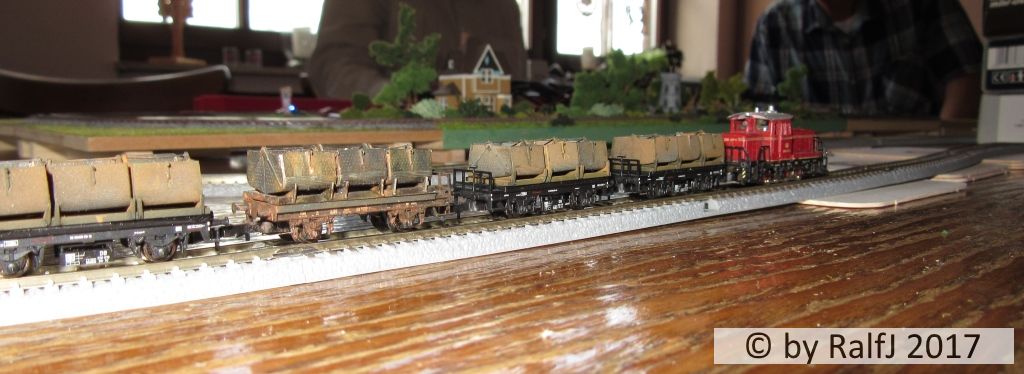 "Muldenwagons" wurden von einer V60 und später mit einer Köf transportiert. Bei der Köf ist der Rangierer bereits bereit zum Absprung ;)