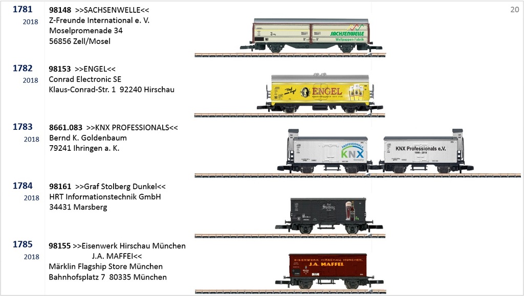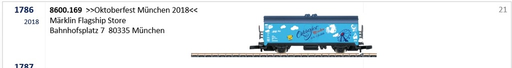 Ja, der ENGEL ist schon seit einiger Zeit im Werbemodelle-Katalog auf der Sammler-Seite der ZFI zu finden und der Oktoberfestwagen 2018 wird mit Miba-Nr. veröffentlicht, sobald er von Märklin ausgeliefert wurde: https://www.maerklin-store-muenchen.com ... rmodell-2/