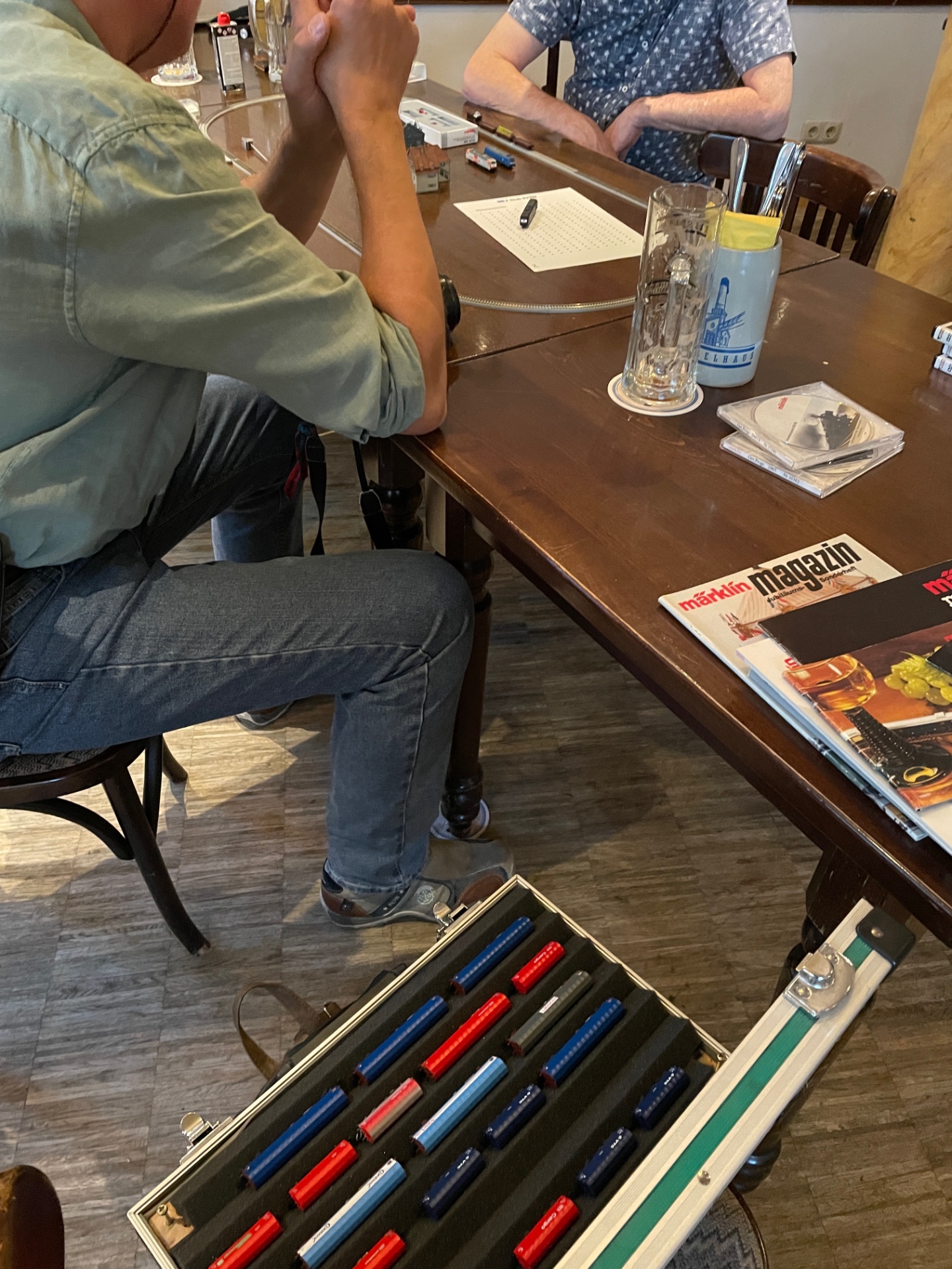 Die Stimmung gehoben hat die Märklinlieferung mit unseren Stammtischwagen, siehe oben. Es sind noch Wagen verfügbar. Wer wer welche möchte wendet sich an Manfred (m.frey2@arcor.de). Er bringt bestimmt beim nächsten Stammtischtermin nochmal ein paar Wagen mit - für diejenigen, die aus welchen Gründen auch immer heute noch keinen Wagen bekommen haben. Bei den Märklintagen werde ich auch noch welche dabeihaben.