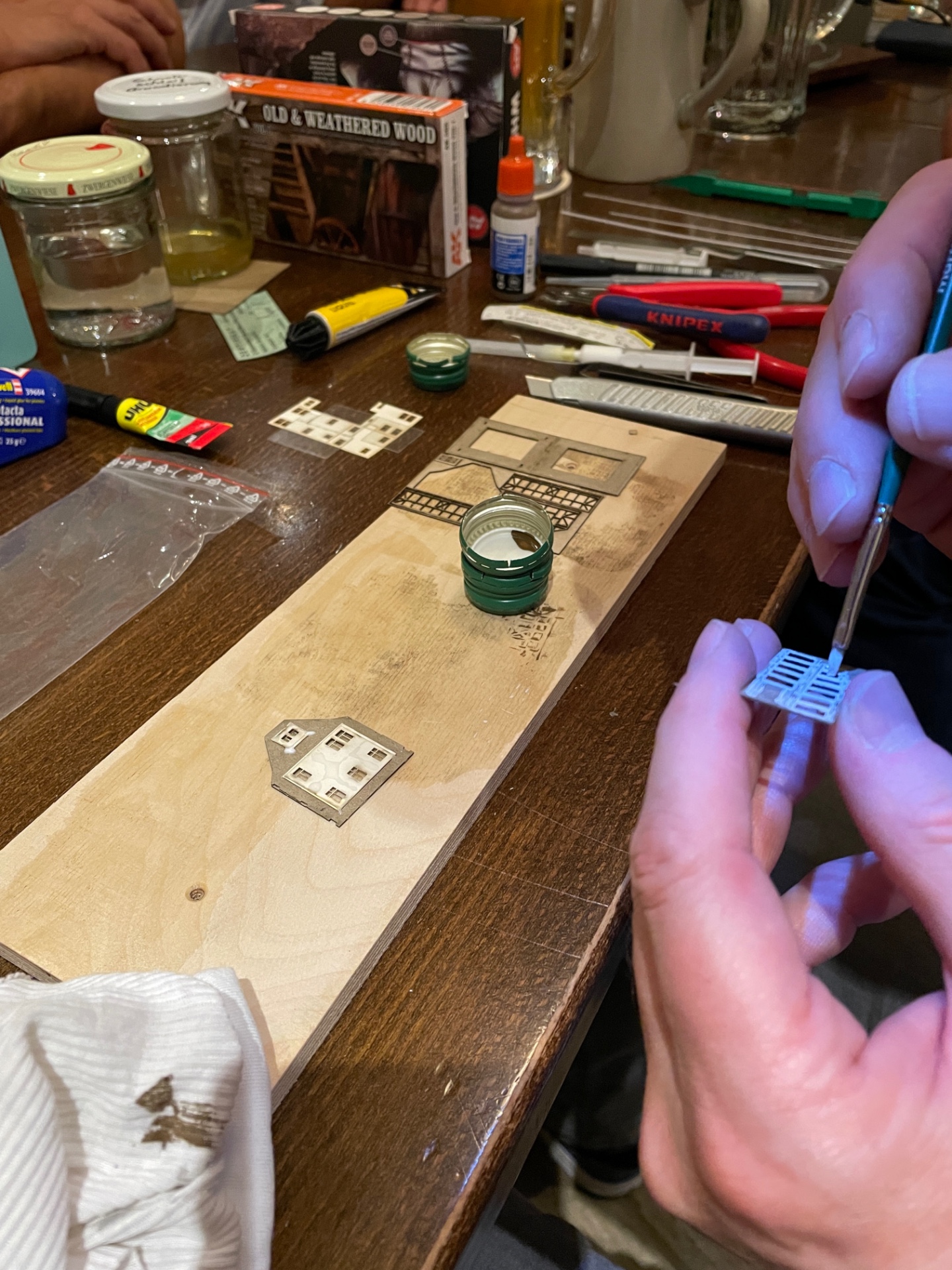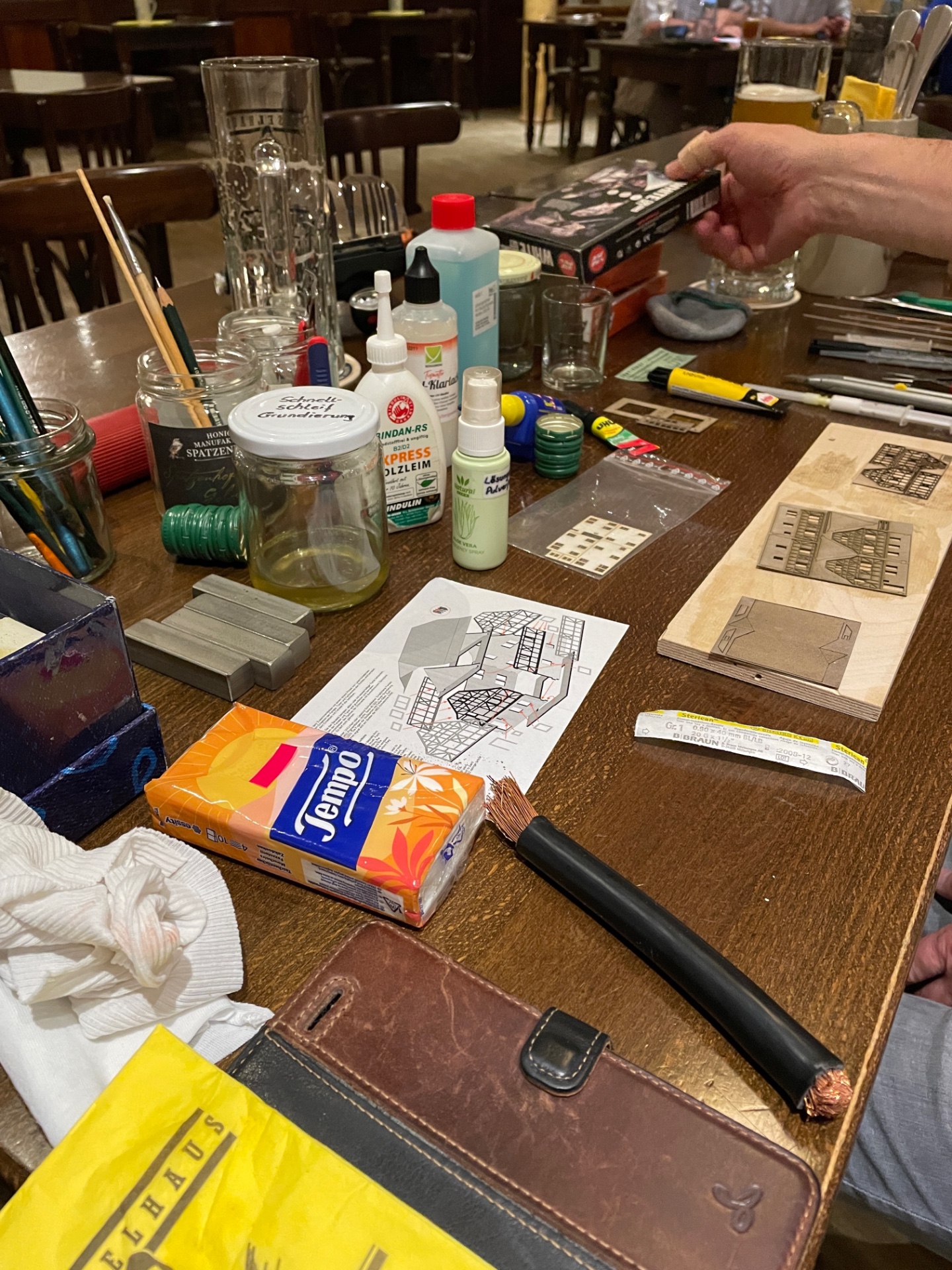 Karl hat gezeigt, wie MBZ-Gebäude farblich behandelt werden, Volker hat seine neuen Schneebrettchen gezeigt, Jürgen hatte eine uralte BR 216 mit neuem Faulhabermotor dabei, mein Kurzschluß wurde gesucht, auf der Brettlesbahn war Betrieb und Klaus hatte seine mobile Kleinstanlage dabei.