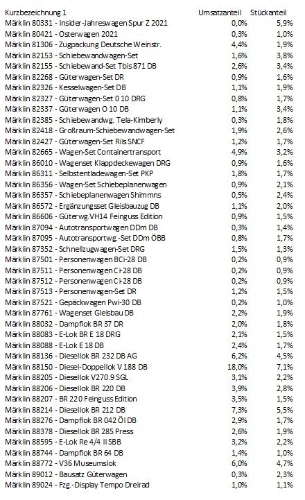 Ich mag die 64, habe sie aber das letzte Mal zurückgegeben, da sie mit dem Getriebedeckel immer an den Weichen hängen geblieben ist. Da ich nicht davon ausgehe, dass Märklin da einschneidende Verbesserungen vorgenommen hat, bleibt sie auf der No-Go-Liste. Ich habe definitiv keine Lust, an einer neuen teuren Lok zu basteln, damit sie vernünftig läuft. Will sagen, manchmal gibt es auch andere Gründe als die reine Attraktivitätsfrage.Torsten83 hat geschrieben: Mo 1. Feb 2021, 20:06 ...und die DB Dampfer performen überraschend schwachbesonders die 64. Ich mag die Lok nicht, dachte aber bisher der Bubikopf wäre generell ziemlich beliebt.