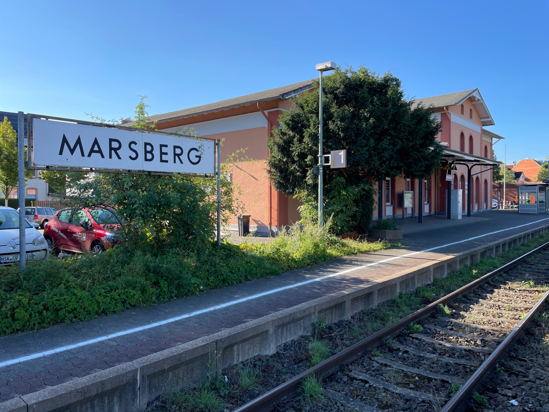 Morgens habe ich noch einen Abstecher zum Marsberger Bahnhof gemacht. Der Baustil des Empfangsgebäudes erinnert mich sehr an Achristories' Bahnhof Torrnstein bzw. Wolkenstein. Die älteste Schiene, die ich gefunden habe, steckt im Bahnsteigdach und stammt von 1877. Sie wurde von G. H. Hütte (=Gute HoffnungsHütte?) gewalzt.