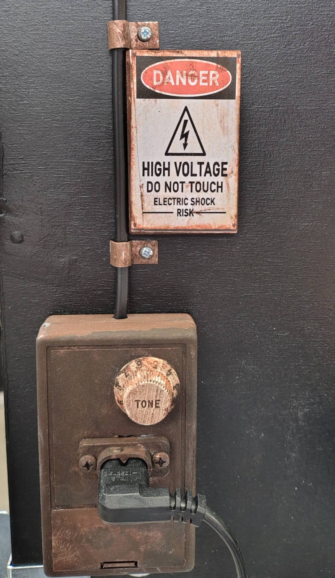 Somit sind sämtliche elektrischen Verarbeitungen von Jörg auf dem absoluten Stand der Technik … gegenüber dem Ursprungszustand. Siehe Bild Übrigens … diese Hightech Lösung war auch bei „Hangman´s Tree“ live bei der Untereschbacher Ausstellung im Mai 2025 zu beobachten.
