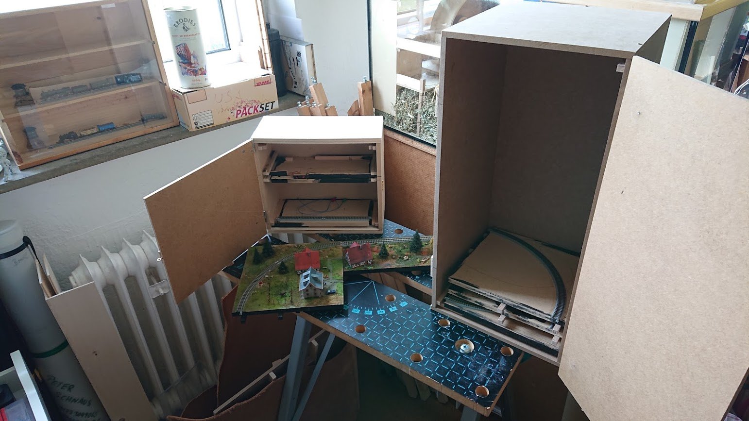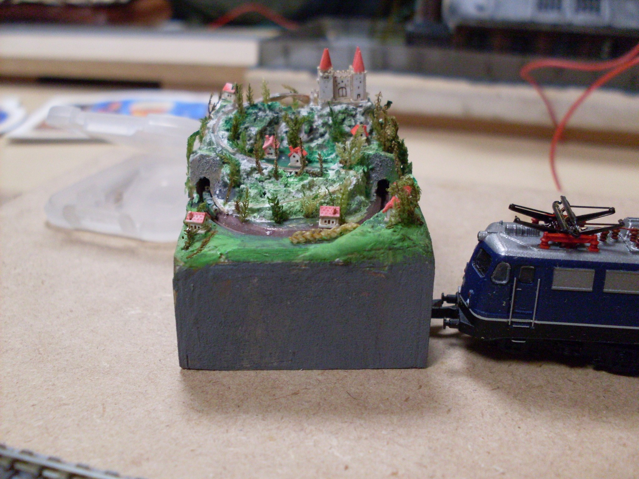 Bei genauem Hinsehen sieht man das hier ein Zug seine Kreise derht Grundfläche itgendwo zwischen 4X4 und 5x5 cm Ein Vergleich von der Krüger V188 und den Gehäusen von NOBA. Das NOBA Modell ist noch nicht fertig und die Gehäuse liegen lose auf dem Rokuhan Shorty. Deswegen sieht das ganze auch so schief aus.