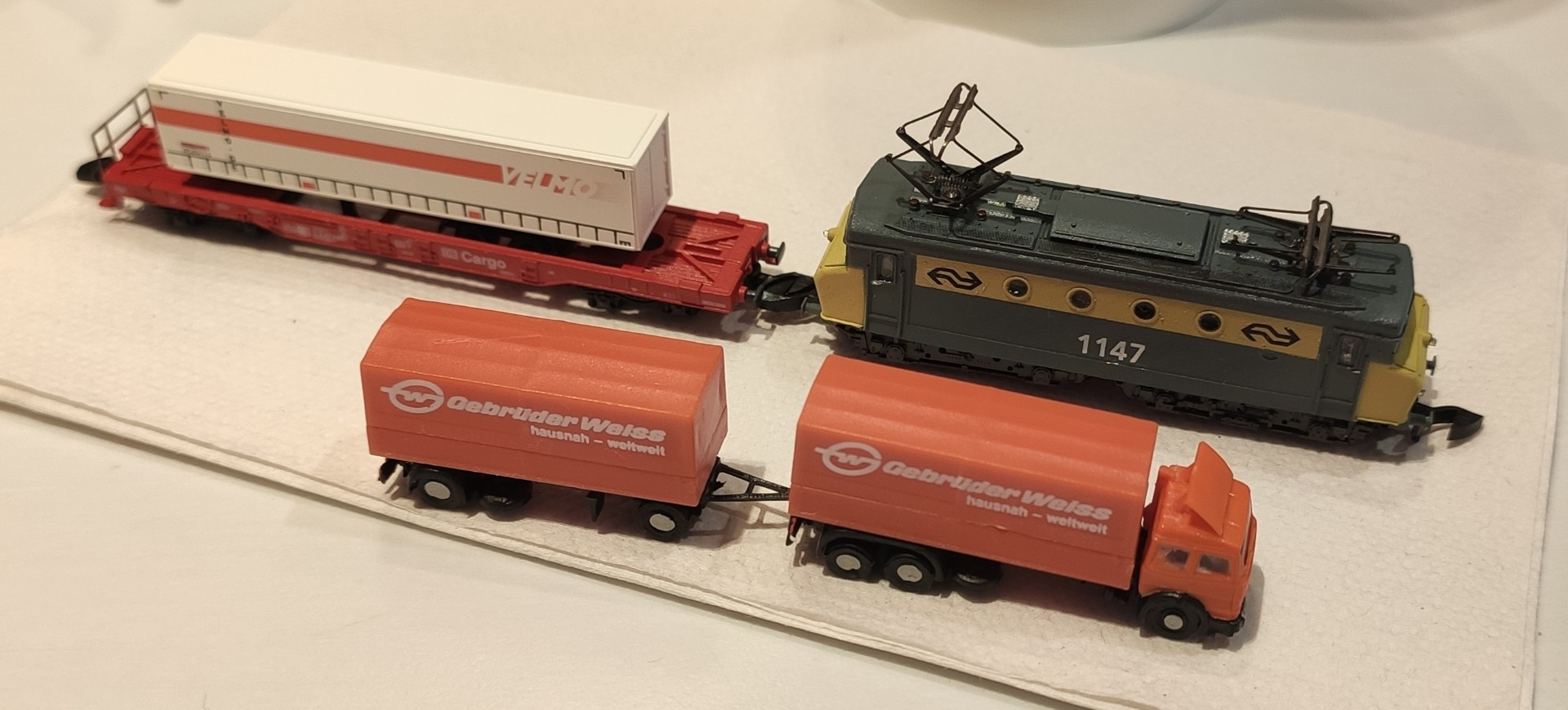 auf Basis einer Märklin E44. Bei Velmo habe ich einen seiner Huckepack-Wagen mitgenommen und dann kam noch ein kleiner LKW mit: