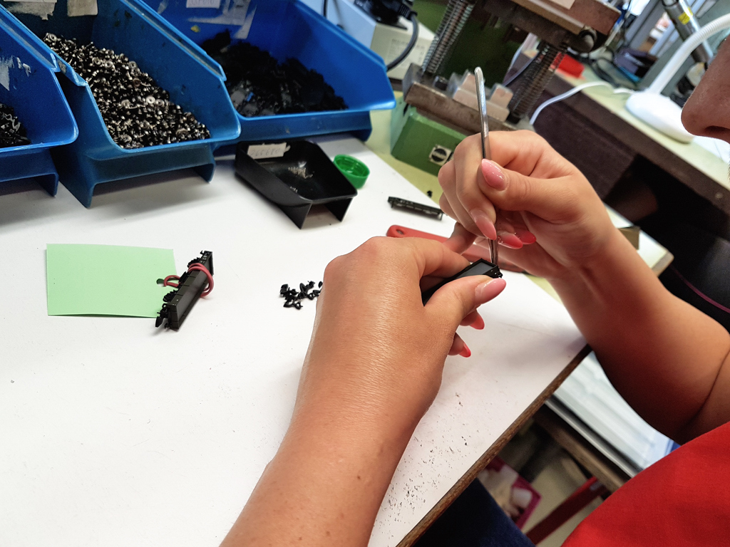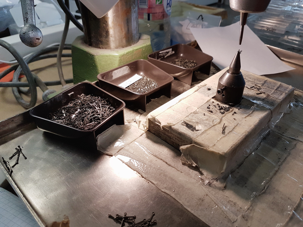 Ein Teil des Gestänges einer Z-Damplok wird genietet. Die junge Dame erklärt: "der Punkt am Nietloch muss rechts oben sein beim Einpassen" Na schön. Ich habe mit bloßem Auge kaum das Nietloch gesehen, geschweige den Punkt: