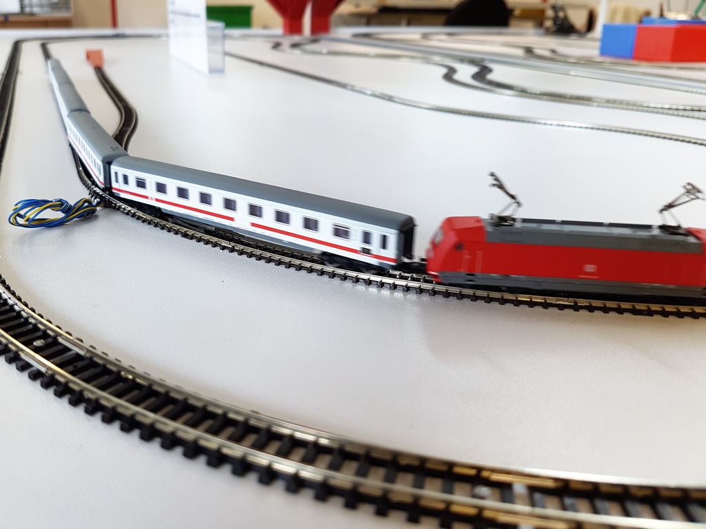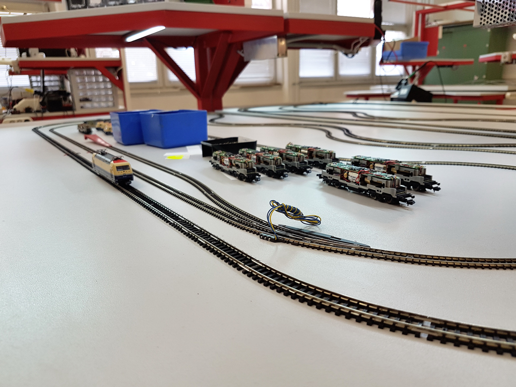 Es kamen tatsächlich die Kleinpaletten von der Fertigung, und während wir zuschauten, haben die Kolleginnen eine Lok nach der anderen aus der Palette geholt, auf dem Tisch aufgegleist, herumgefahren (unter Kontrolle von Spannung und Impulsform, überall waren kleine Spez-Multimeter für die analoge und Oszis für die digitale Testtische angeschlossen). Dass trotzdem Fehler durchrutschen können, bestreite ich nicht, aber die Kontrolle ist wirklich da. Eine sagte: "Ja, ich tu den ganzen Tag nur Modellbahn spielen... aber nach einigen Wochen mit 8 Stunden am Tag wird es schon etwas fad