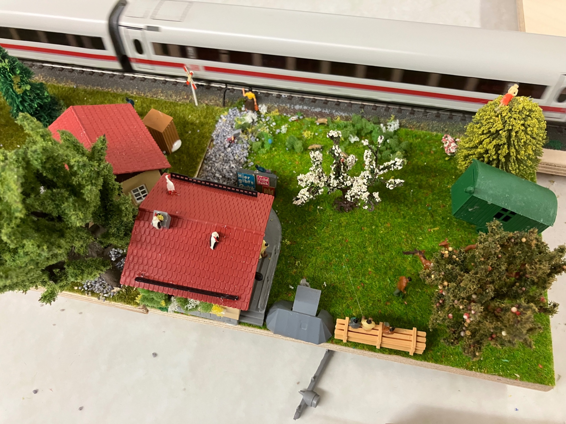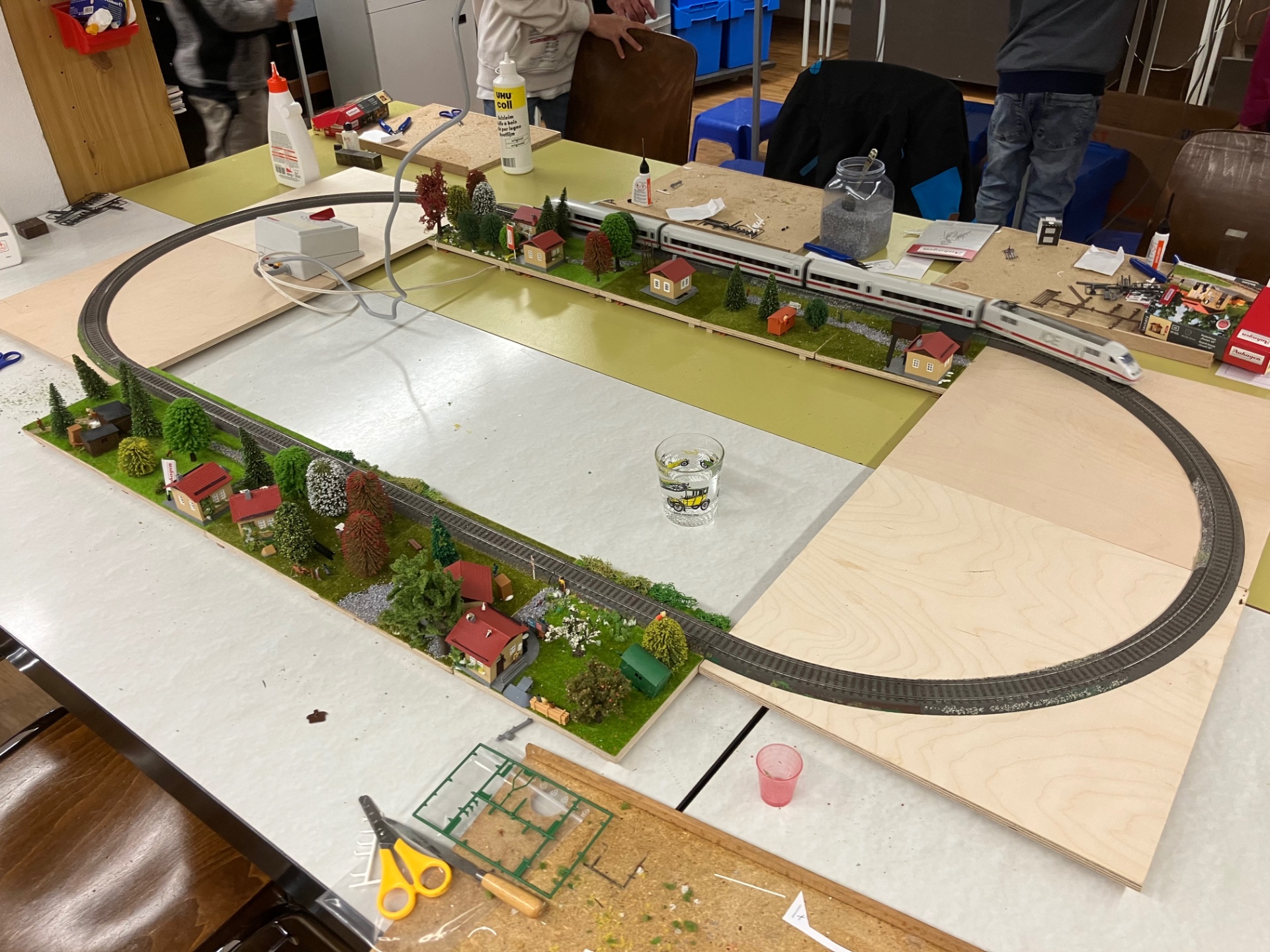 Es hilft nichts den Zustand zu beklagen, dass nur „alte graue Männer“ das Modellbahnhobby pflegen! Ihr müsst aktiv auf die Jugend zugehen und die Kinder mitnehmen. Wir hatten heute im Verein 10 Kinder aus der 4. Klasse zu Gast. Wir haben gemeinsam ein Häuschen gebastelt und dieses nachher auf ein H0 Stammtischbrettchen geklebt und dann ausgeschmückt. Es war beeindruckend wie still die 10 Kinder dort konzentriert gebastelt haben! Von den 10 Kinder waren 3 Mädchen, die sehr kreative Kleindioramen gebaut haben. Am Schluss wurden die Brettchen zusammengesteckt und der ICE fahren gelassen. Wir müssen die Jugend einbeziehen dann ist auch der Nachwuchs da. Erstmal mit H0 anfangen, Z kommt dann schon… Nach den 10 Viertklässlern kam dann noch die 5 Jungs der Jugendgruppe, die mit Begeisterung ebenfalls an Ihren Brettchen das Modellbahnhobby von der Pieke auf spielerisch erlernen. Ich war heute begeistert von den 15 Jungen und Mädchen im Alter von 9 bis 12! Ein paar Impessionen habe ich noch angefügt.