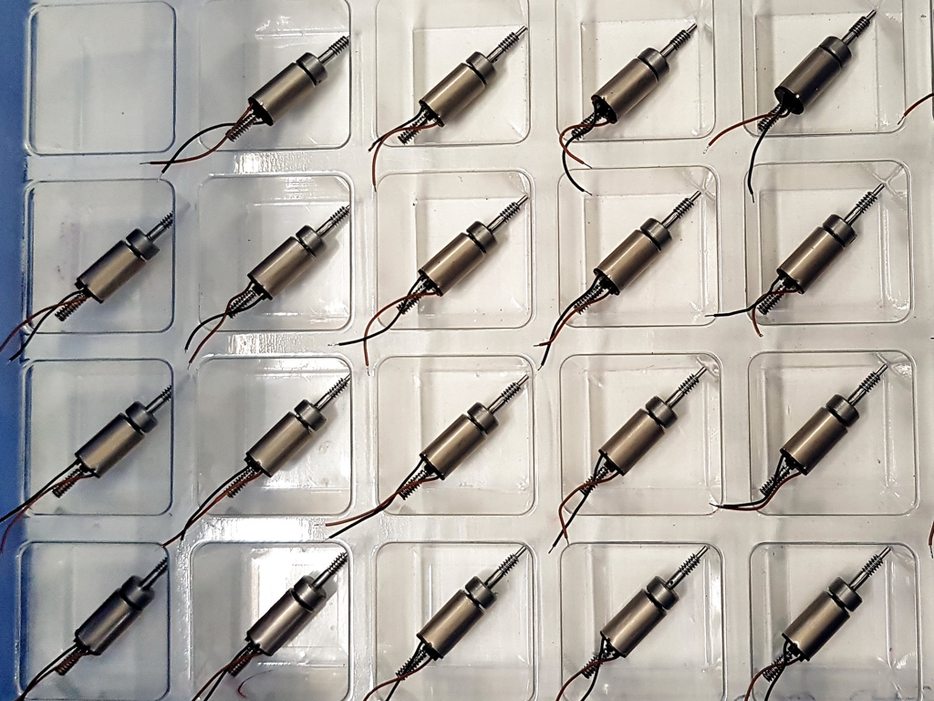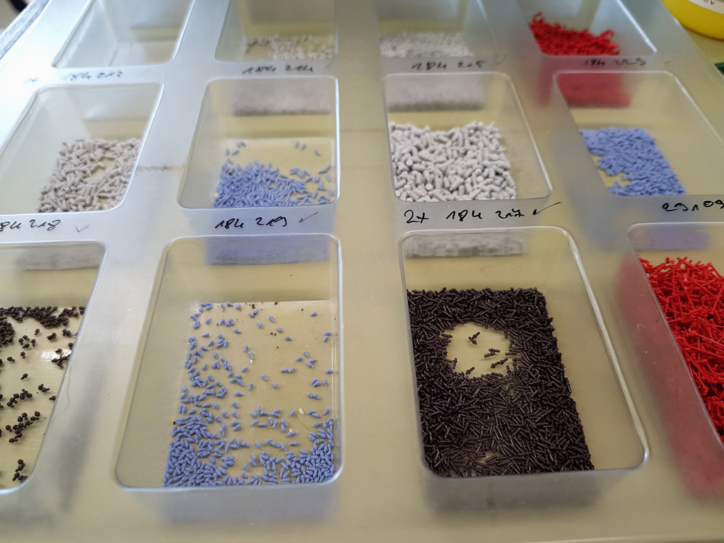 Die fertigen Einheiten kommen dann in die Ablagetasse, und zwar alle gleich ausgerichtet abgelegt für den nächsten Roboter-Arbeitsgang: