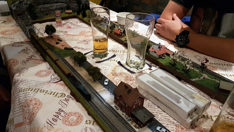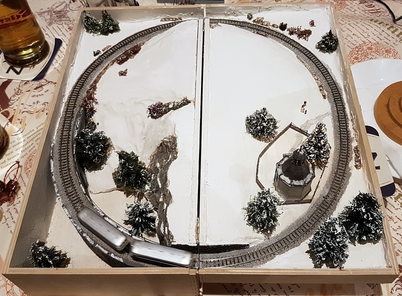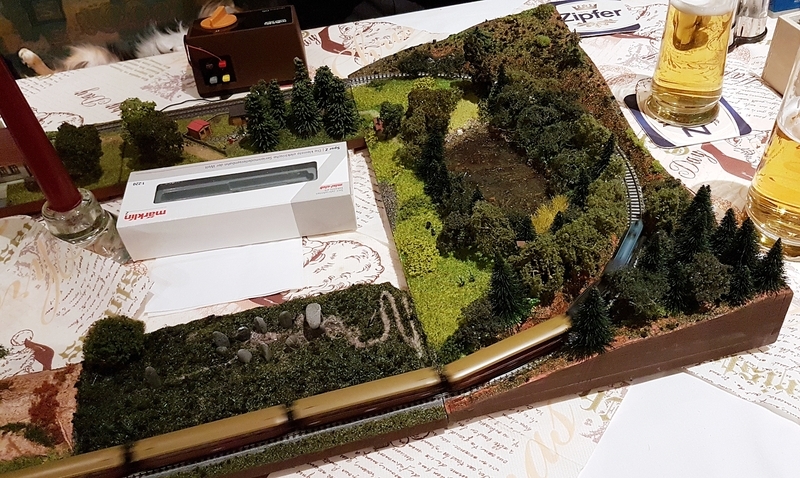 Es wurde auch wieder mal ein wenig gefahren. "Minianlage" aus vier Stammtischbrettchen, mit modularer Hintergrundkulisse und Vemos D1-WLAN-Steuerung: