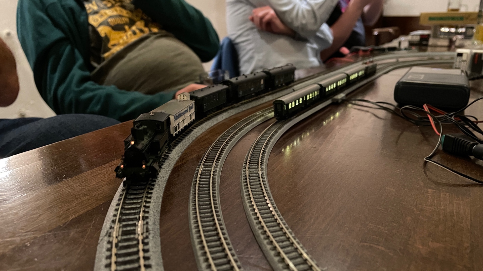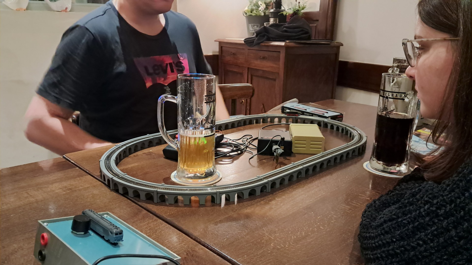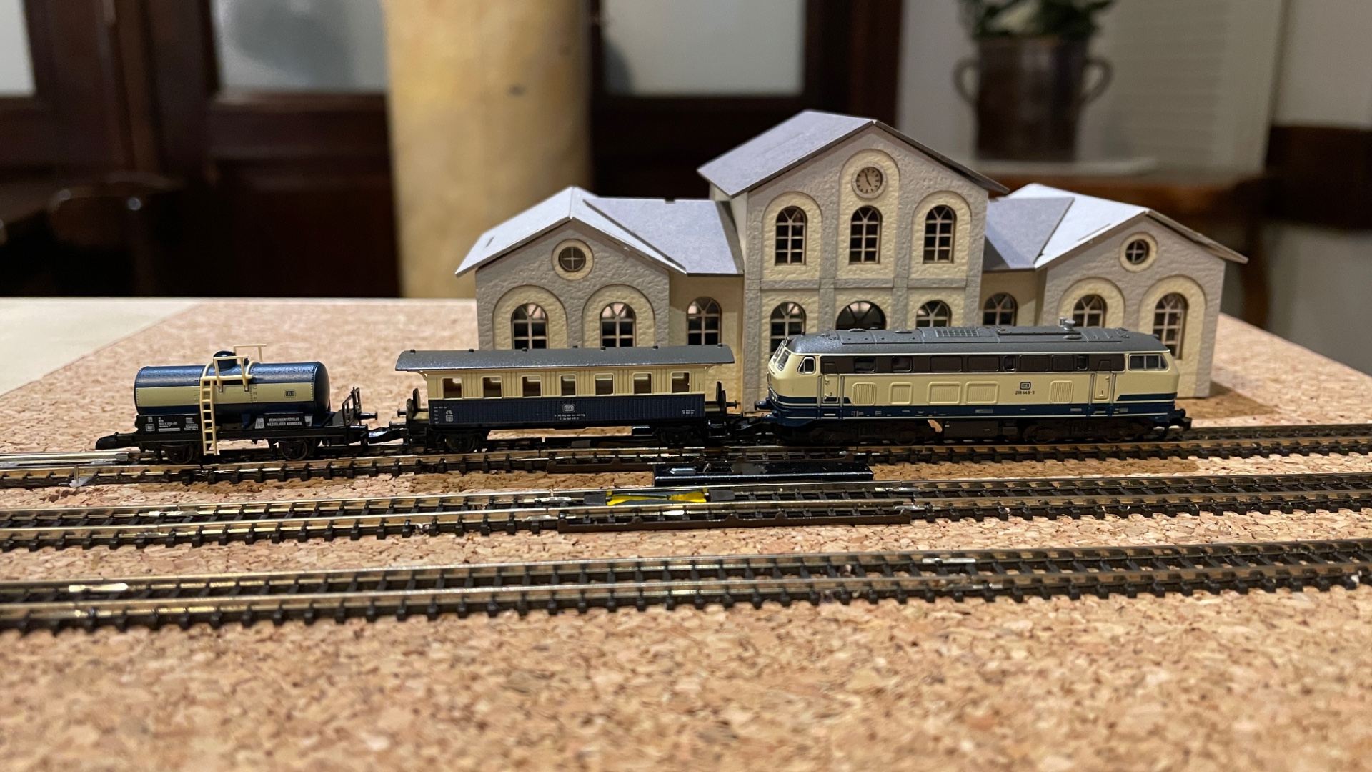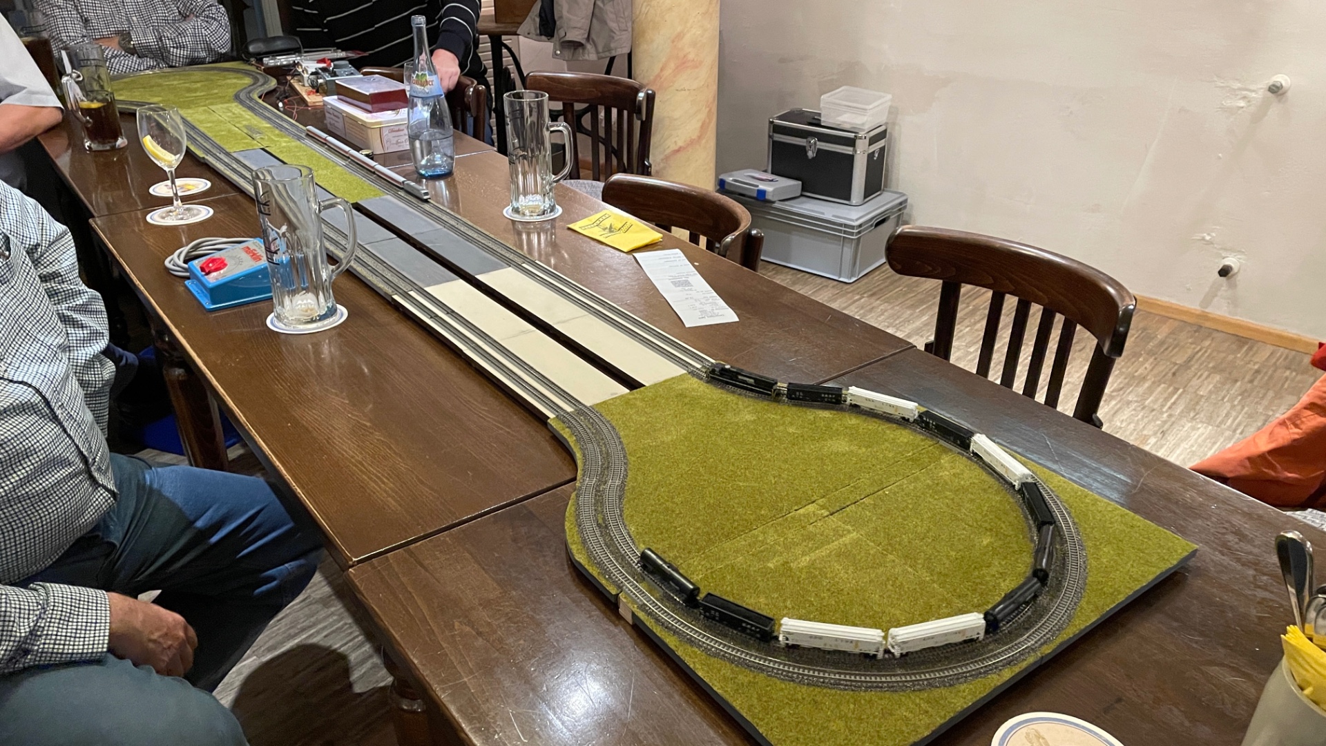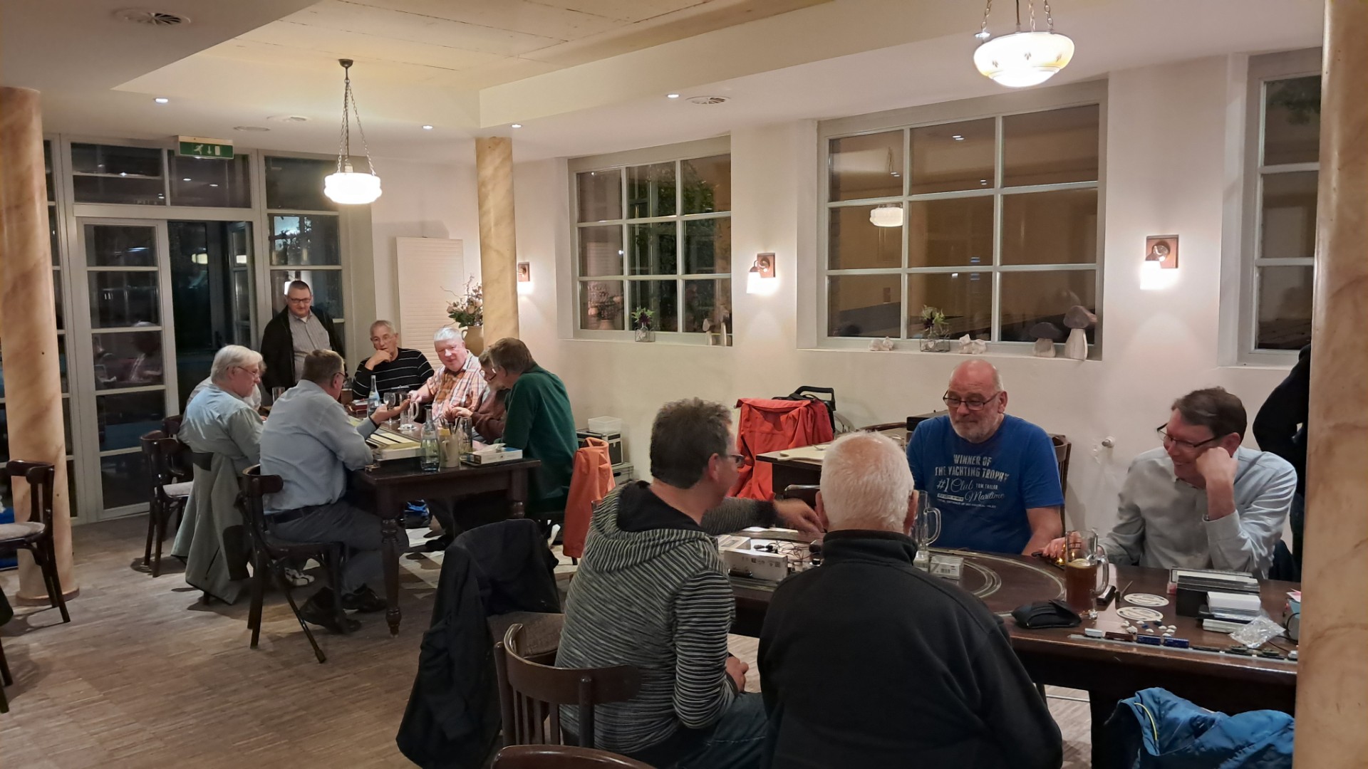 Wir hatten auf 4 Tische Anlagen mit 7 Fahrmöglichkeiten und einen Kreis für die Spurweite N. Auf den einzelnen Anlagen fuhren immer wieder andere Zug zusammen Stellungen, nicht nur ein Zug. Ein schöner Abend war es wieder Gruss Dieter.