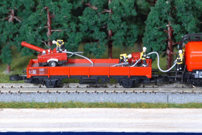 Feuerwehrleute im Einsatz Detail Der Niederbordwagen ist mit einer TS 8/8 (Tragkraftspritze) bestückt; im Tankwagen ist selbstverständlich anlagenverträgliches Löschmittel. Detail, wieder auf Mikro - Modul (beim Brandstreifen löschen) Man beachte die hervorragende Lackierung - bei den Feuerwehrleuten hatte Birgit die Finger mit im Spiel