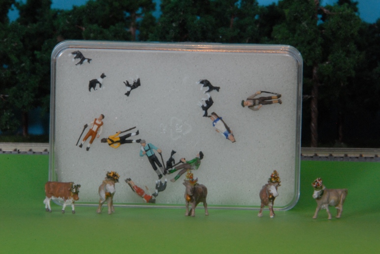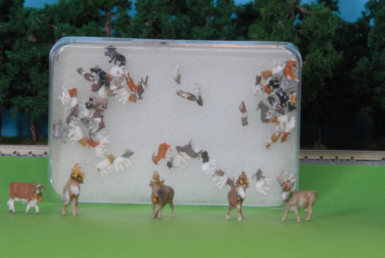und Kühe für den Almabtrieb geschmückt Die Geißenherde war mir zu gefährlich am Stammtisch aufzustellen - die kann man locker einatmen bei den Hütern samt Hüterhunden war es ebenso Natürlich gab es viel mehr - Geisterwagen - eine Kleinplatine zur Gleisspannungsmessung analog, digital - nordlanders Koffer ( der darf auch nach Altenbeken) usw, usf.