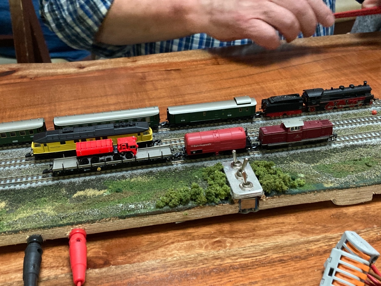 Mai Stammtisch, mit Gespräche über verschiedene Materialien im Gebäudebau, Zubehör, verschiedene Modelle und fahrende Züge.