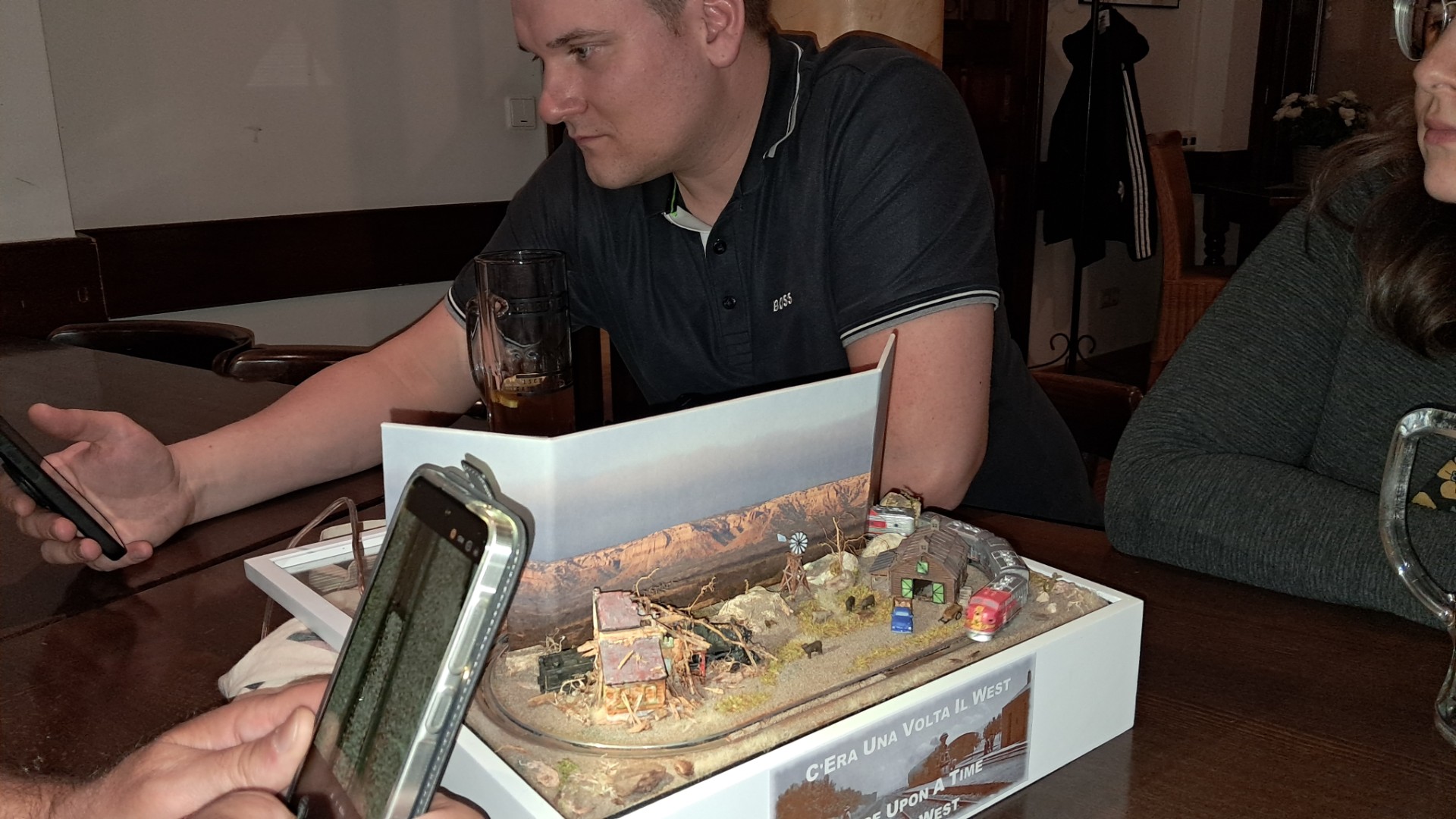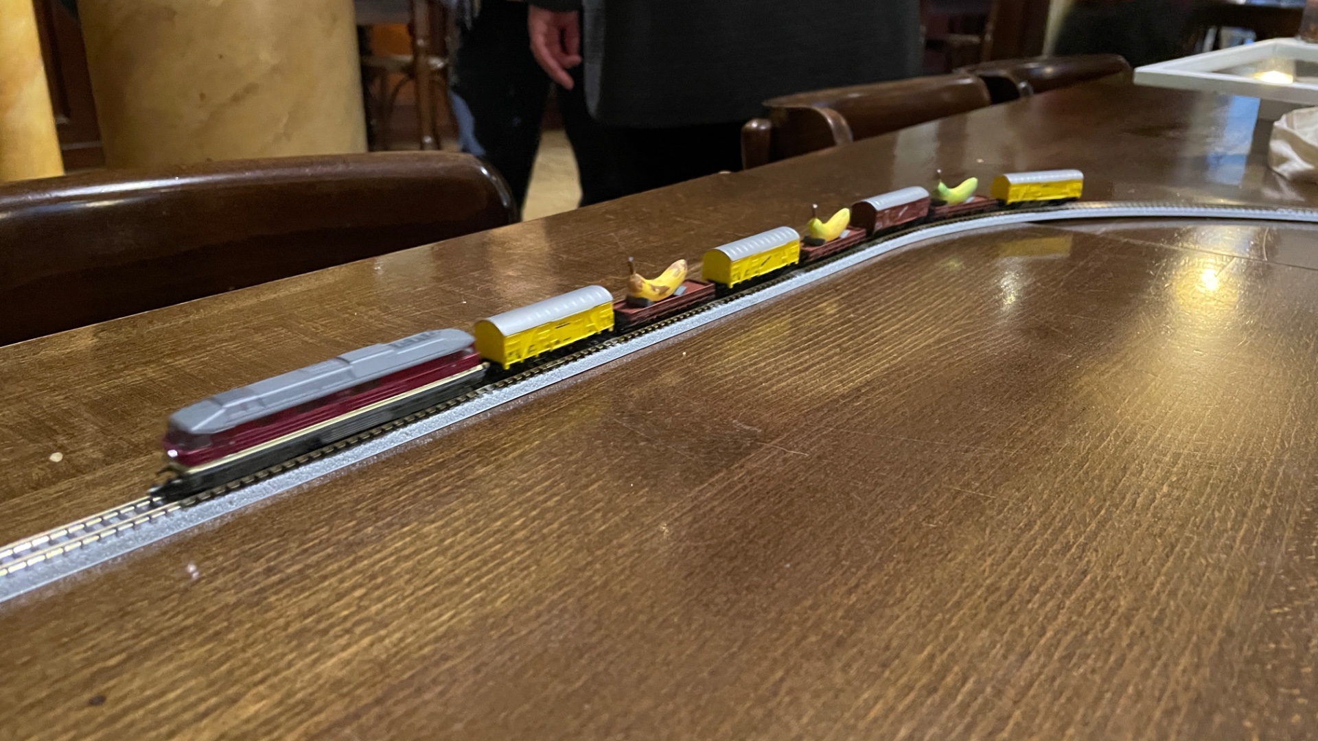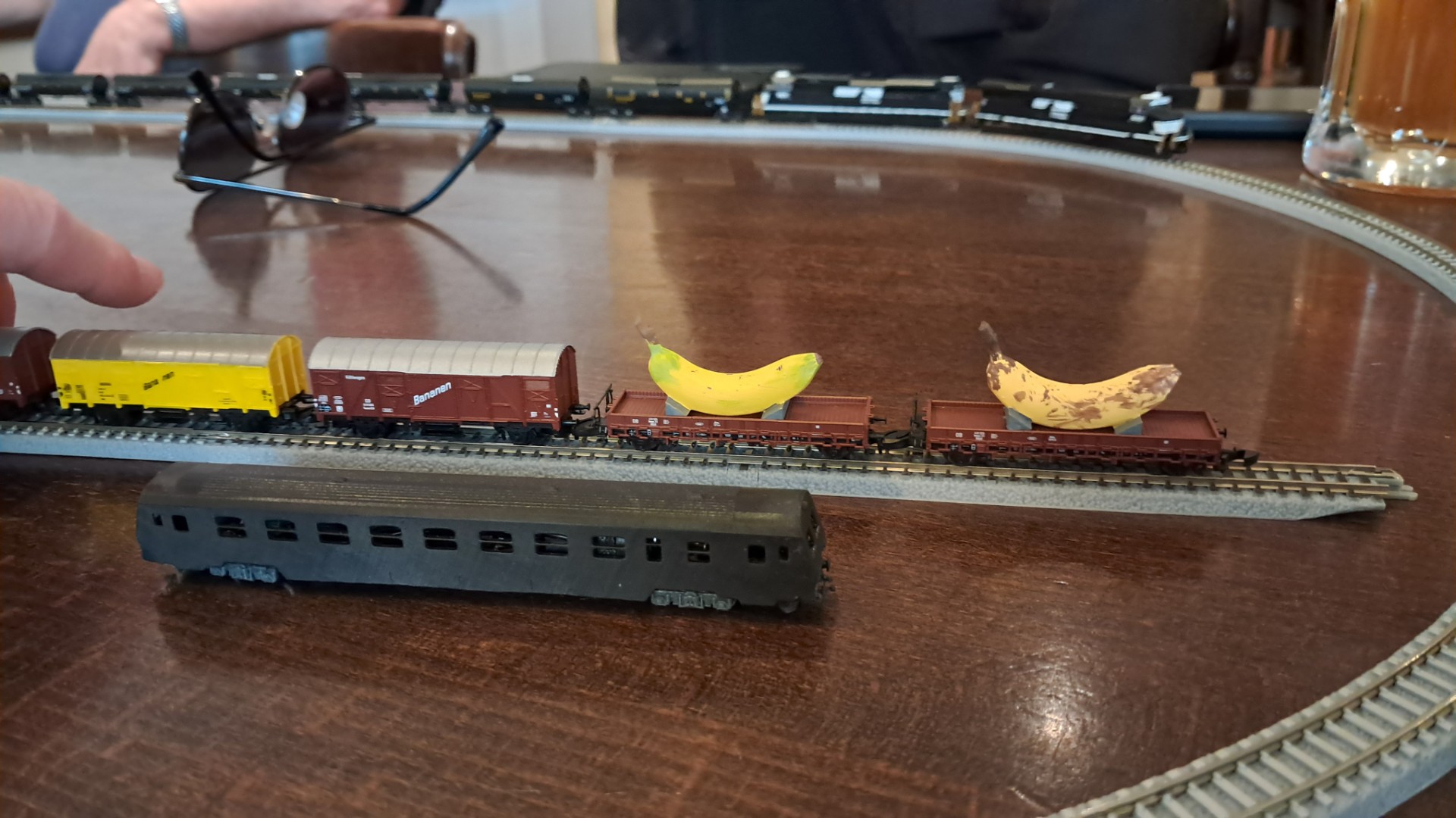 So im letzten Drittel des Treffens konnte ich noch schnell bei Matthias' Aufbau ein Oval aufbauen und den Banana Joe Schleichzug zum Einsatz bringen. Waren bestimmt Stahlbananen, die Birgit gegossen hat und eine V188bzw. die Ludmilla unabdingbar machten.