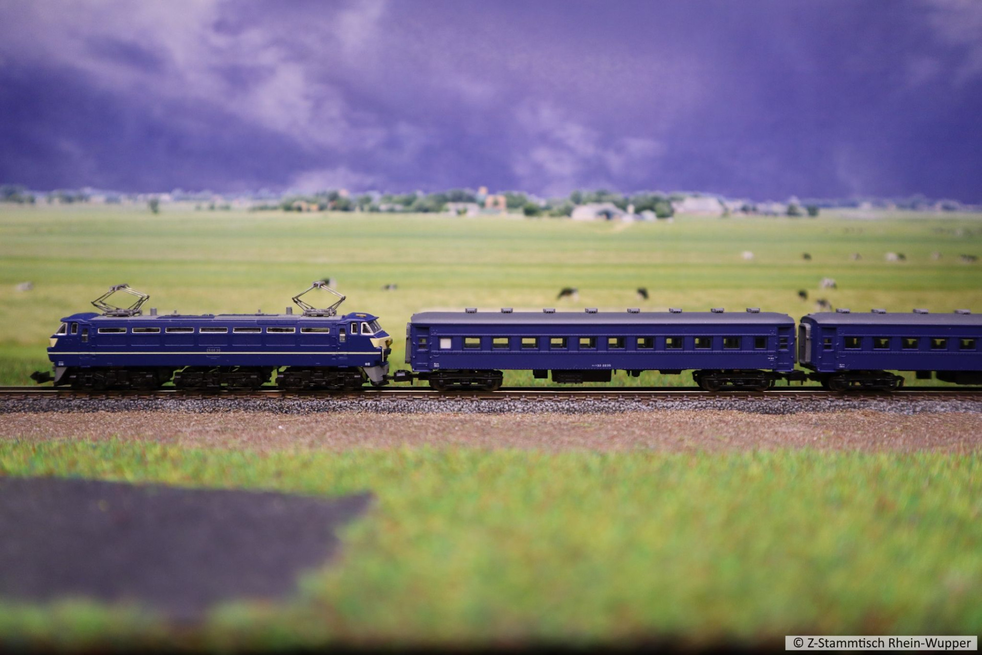 Eine der EF66 von Rokuhan ist dann noch mit Personenwagen von Tenshodo auf den Gleisen unterwegs gewesen