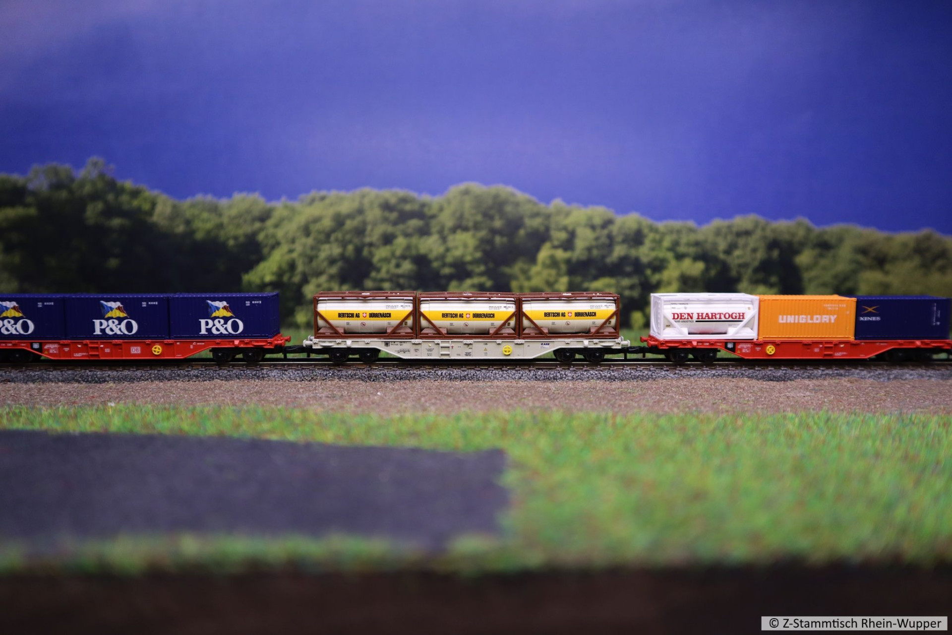 Zum europäischen Containerzug mit Rokuhans DB 181 214-8 hat geschrieben: Anlass für diese Zugbildung war das neue Containerwagenset 82641 von Märklin. Ergänzt wurde es mit Taschenwagen des gleichen Herstellers und Containern von Rokuhan, sowie Freudenreich/MCZ. Entdeckt der geneigte Zetti die vorbildwidrige Komponente der Zusammenstellung?