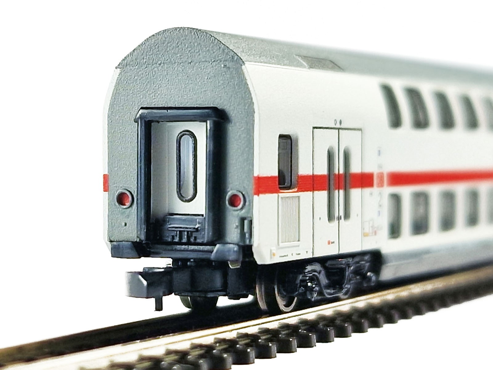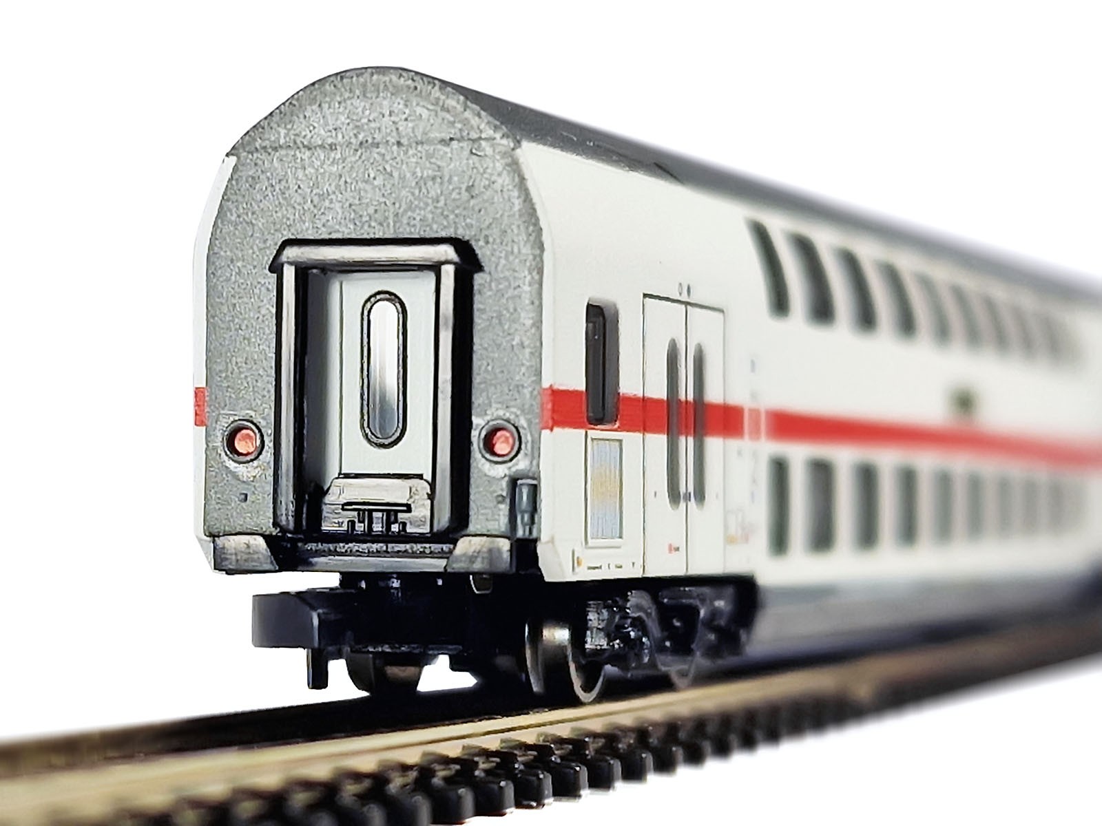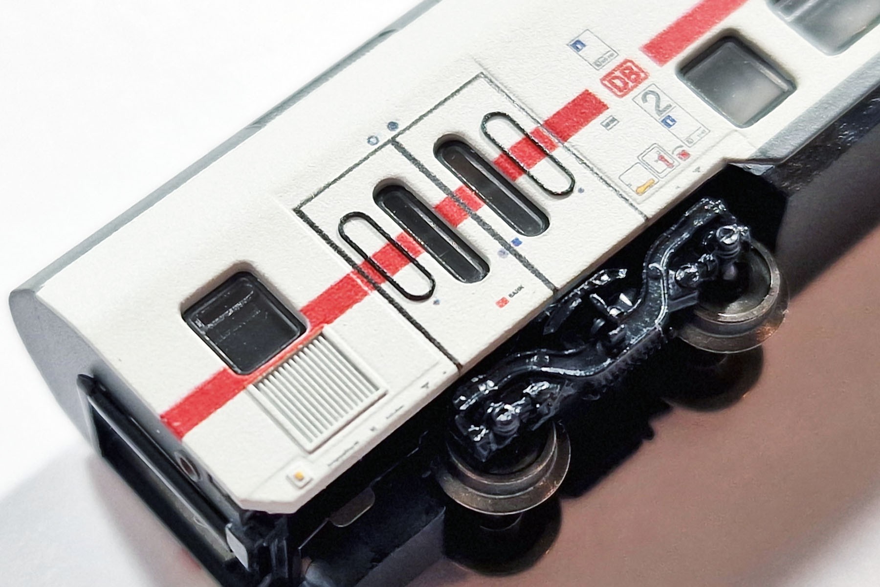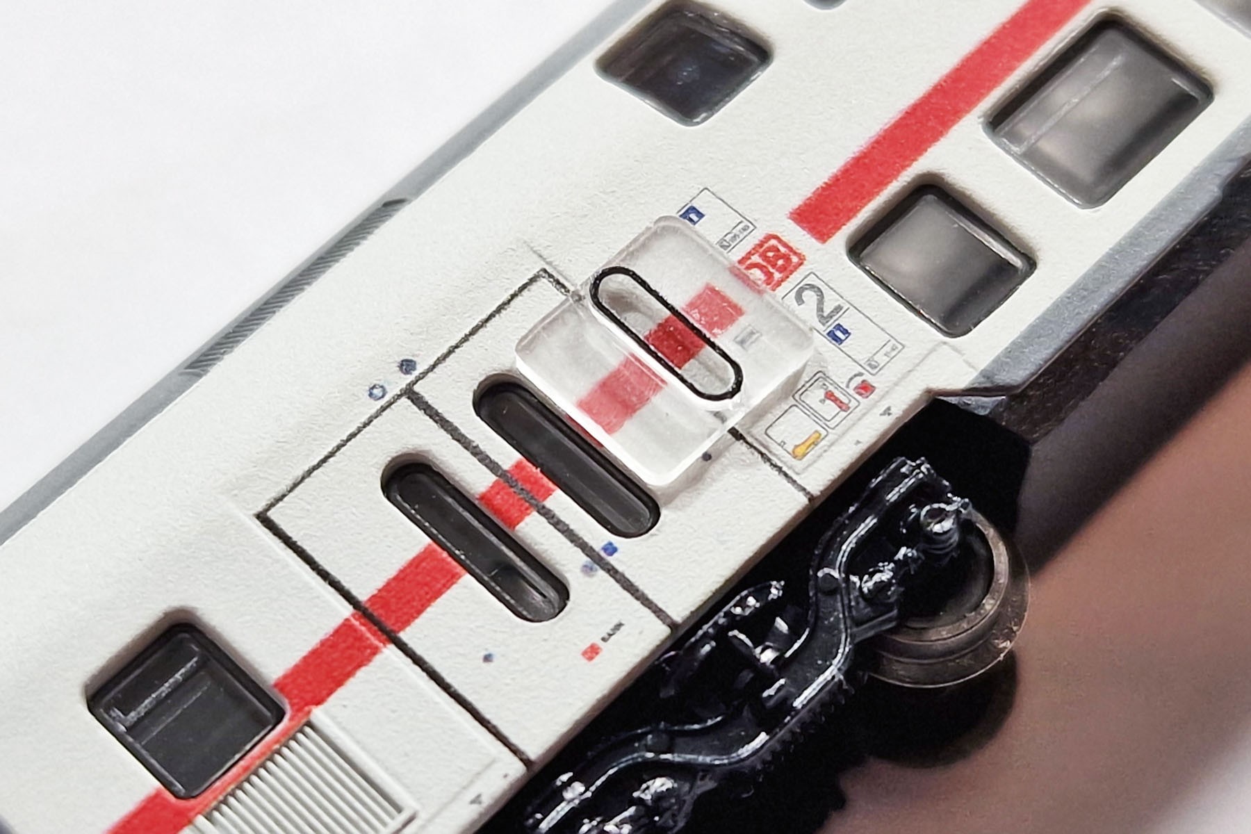 I put these tiny metal parts onto the IC 2 passenger car in order to make a comparison with original rubber bands on side doors and windows: