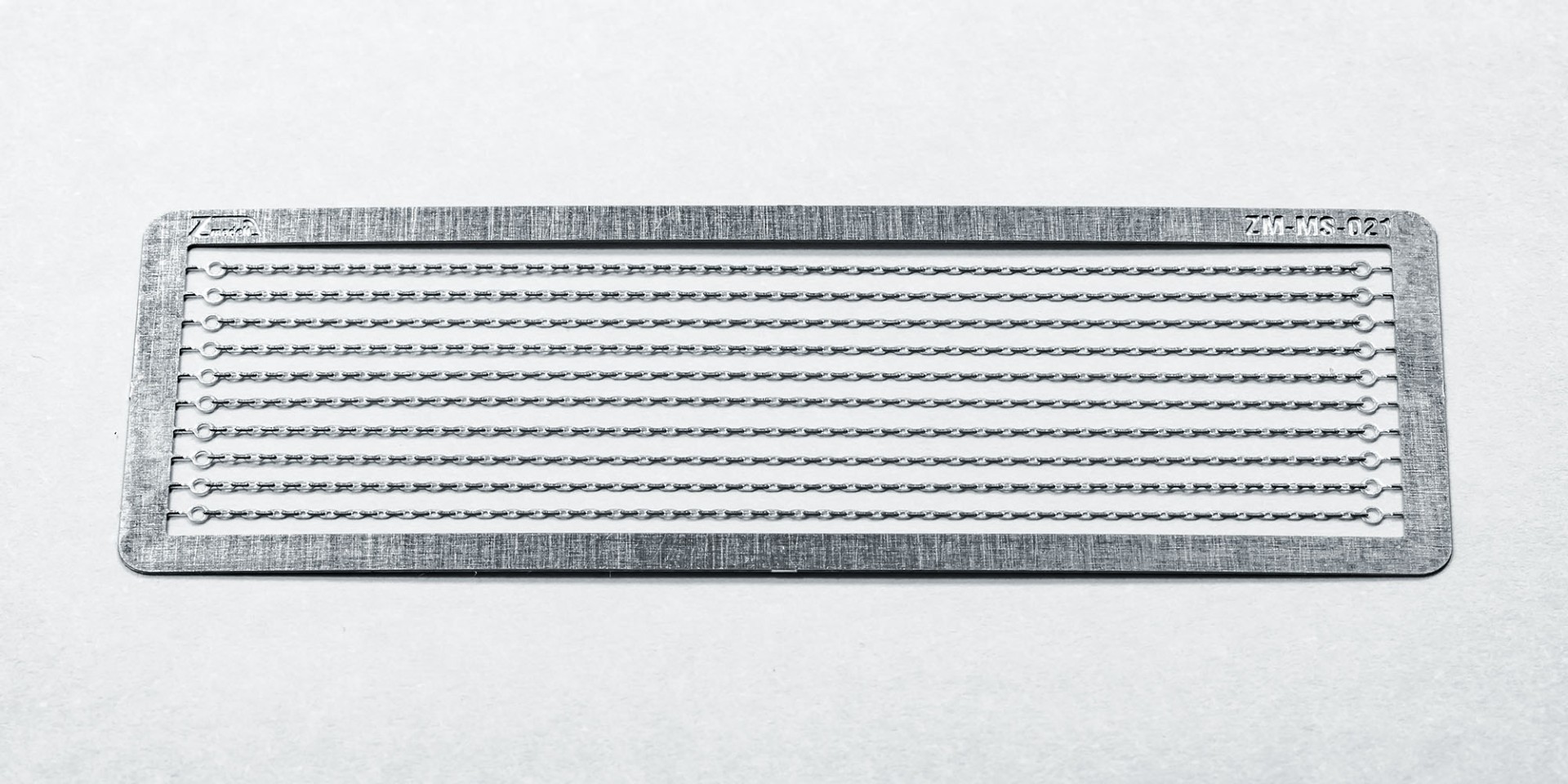 I would like to introduce a small but quite unique addition to the range of my accessories - set of heavy-duty chains. They are made of 0.15 mm photo-etched CuNi19 alloy (variation of nickel silver alloy) and feature fine-scale details and very close to scale dimensions. Very high level of realism is achieved by combination of half-etched elements and ones with full thickness: horizontal chain links are half-etched and have openings in the center, while vertical ones have full thickness. Together with only 0.5 mm width, it gives an unbelievably realistic look. These chains are actually thinner than handrails and barriers on the most Märklin Z scale cars.