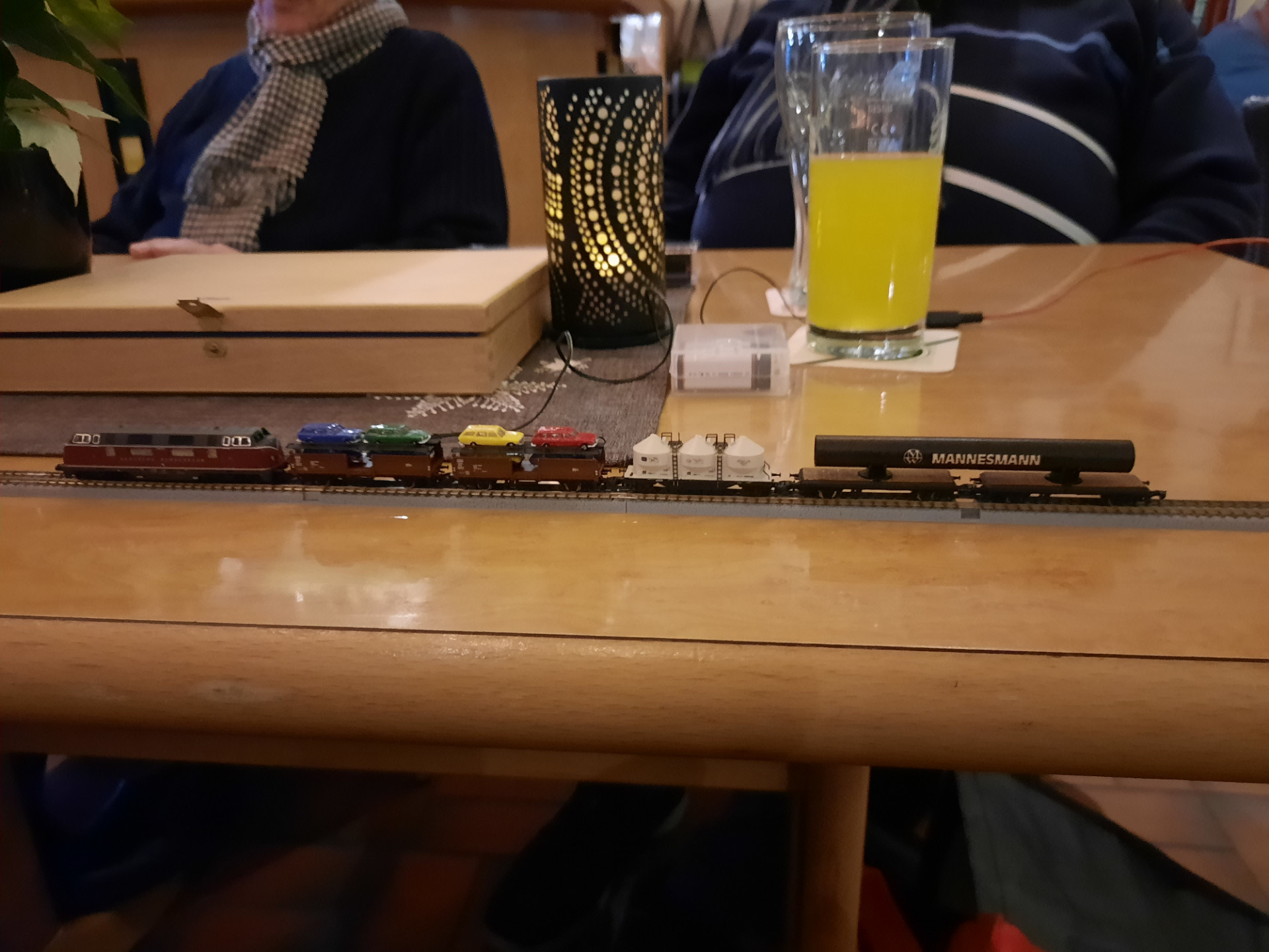 bei unserem gestriges Z-Treffen konnten wir uns aufgrund des vorweihnachtlichen Betriebes in der Vereinsgaststätte nicht ganz so ausbreiten, wie wir uns das vorgestellt hatten. Die mitgebrachten Fahrmöglichkeiten blieben daher eingepackt unter dem Tisch und wir begnügten uns mit ein paar ausgelegten Gleisen. Den Diskussionen – auch zu den mitgebrachten Schätzen - tat das allerdings keinen Abbruch. Und das mitgebrachte Krokodil wird dank fachmännischer Beratung auch wieder in Stand gesetzt werden können.
