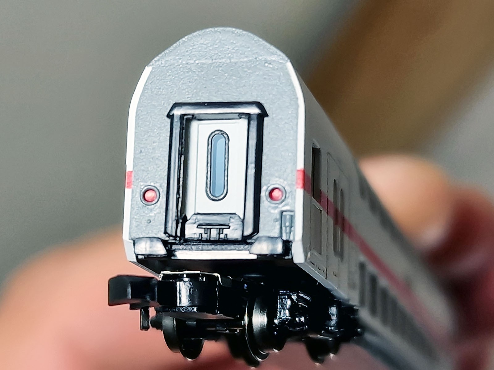 I put these tiny metal parts onto the IC 2 passenger car in order to make a comparison with original rubber bands on side doors and windows: