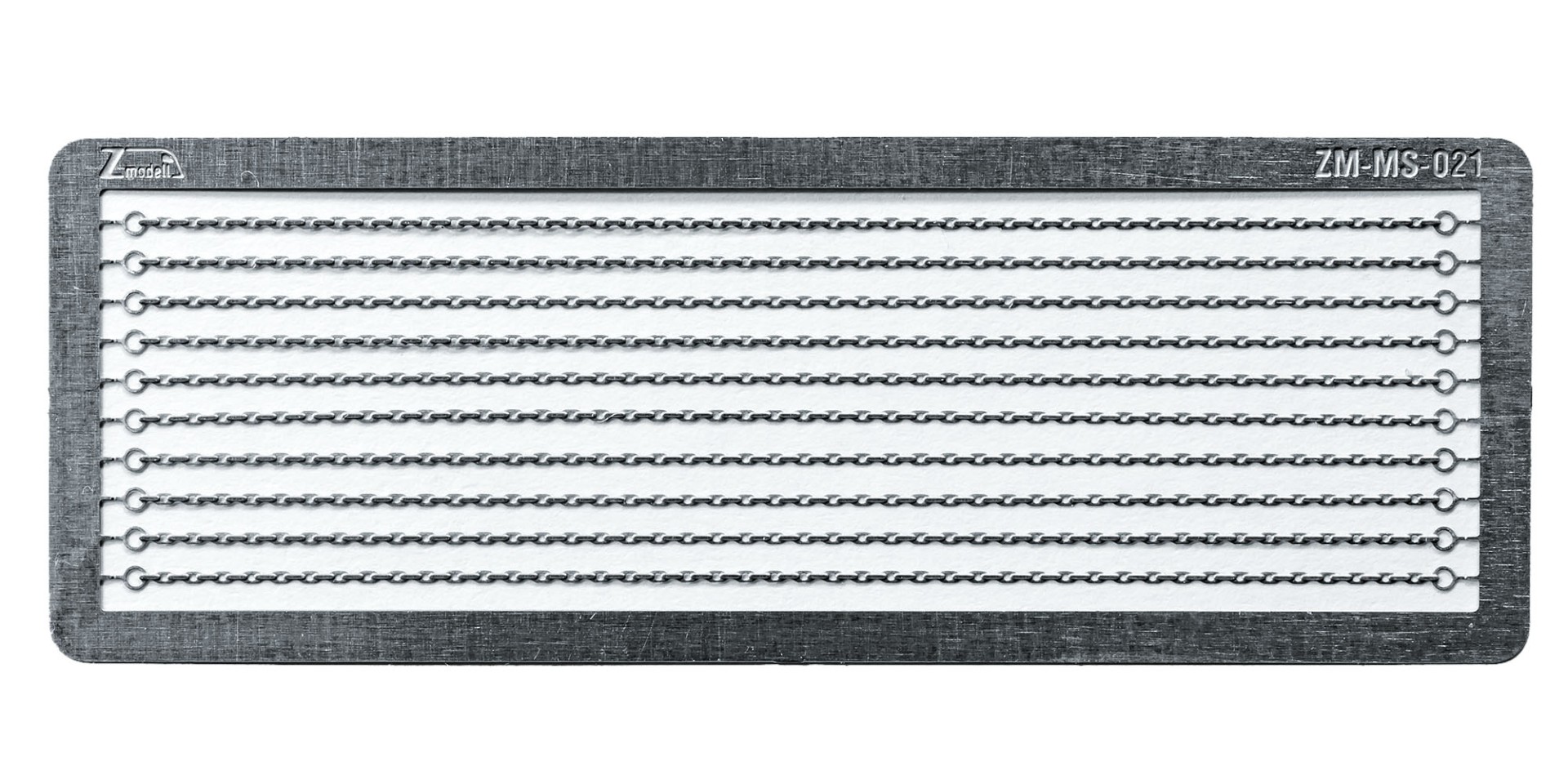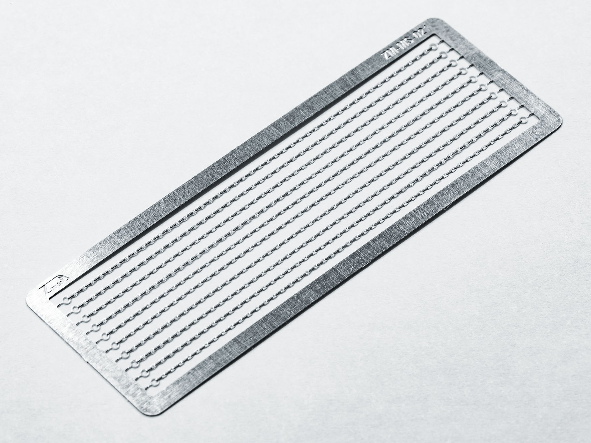 I would like to introduce a small but quite unique addition to the range of my accessories - set of heavy-duty chains. They are made of 0.15 mm photo-etched CuNi19 alloy (variation of nickel silver alloy) and feature fine-scale details and very close to scale dimensions. Very high level of realism is achieved by combination of half-etched elements and ones with full thickness: horizontal chain links are half-etched and have openings in the center, while vertical ones have full thickness. Together with only 0.5 mm width, it gives an unbelievably realistic look. These chains are actually thinner than handrails and barriers on the most Märklin Z scale cars.
