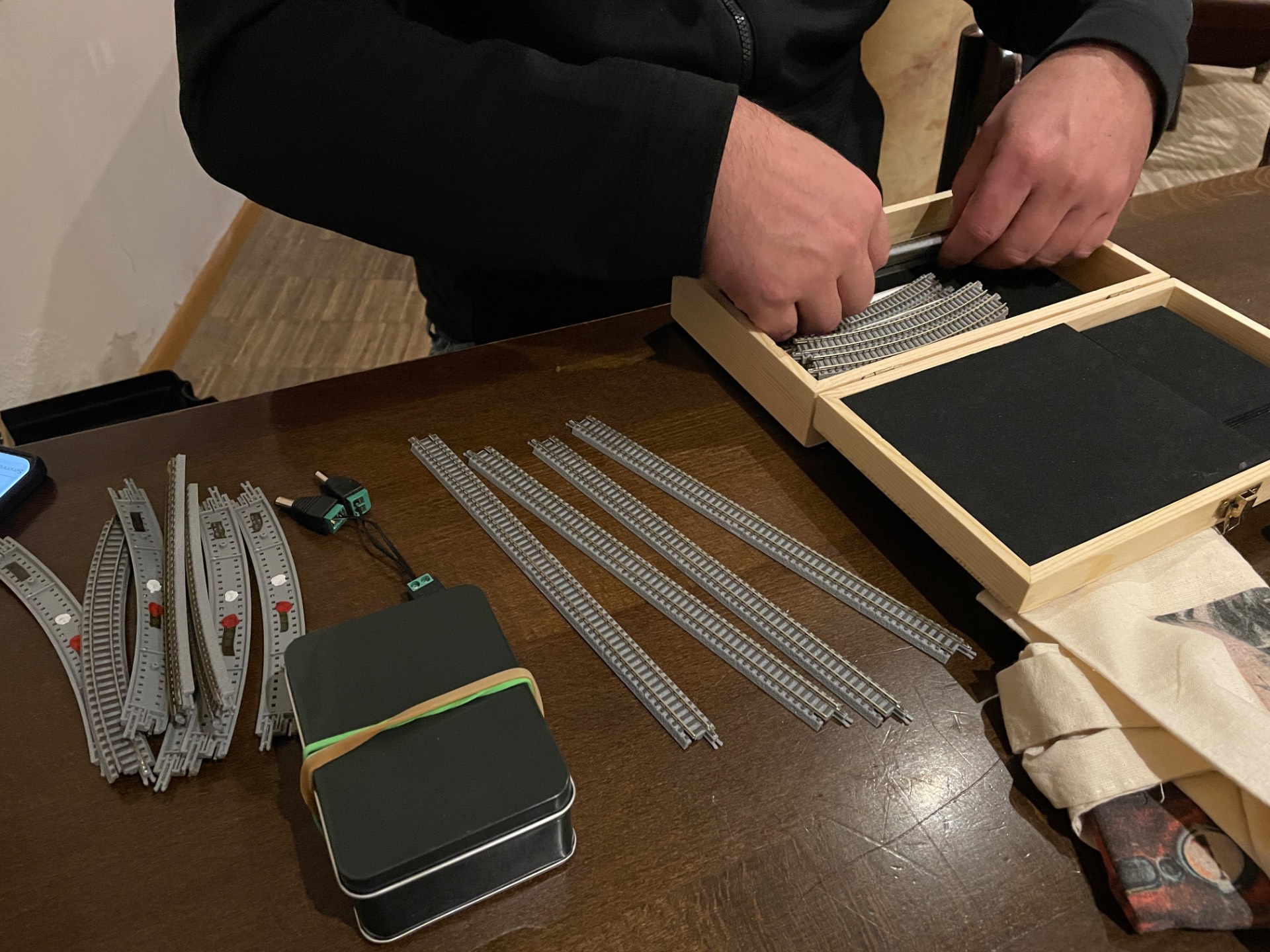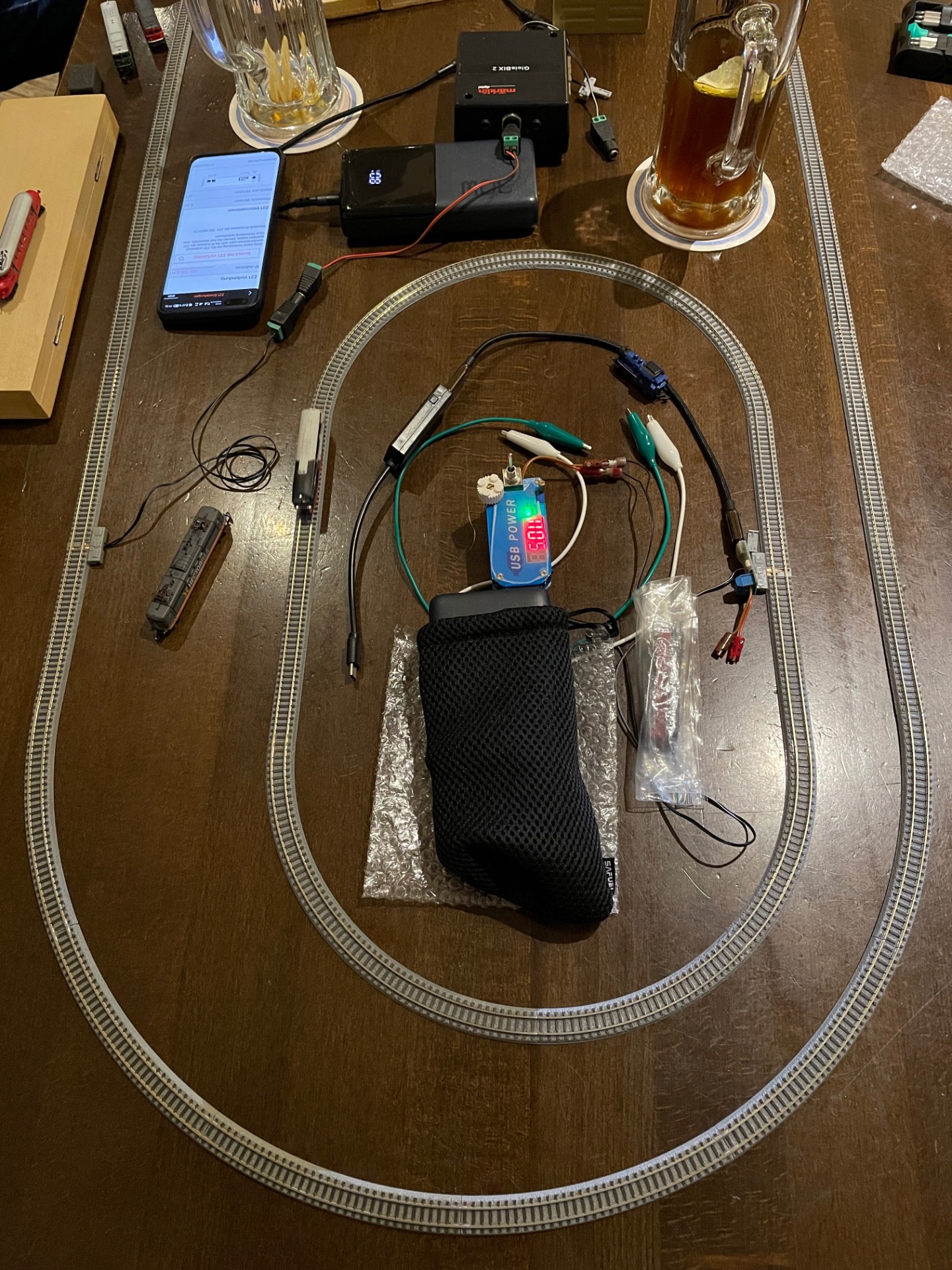 Hier ein paar Schnellschüsse, bevor alles wieder eingepackt war. Es sind zu sehen Klaus' Exoten, Thomas' und Matthias' Testringe mit digitaler, also „geht nicht"-Elektronik, Modellbahntetris und ein Terminausblick.