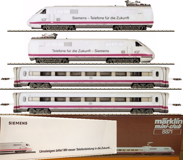 den Siemens-Zug habe ich nicht. Aber auf den Fotos, die ich dazu mal gesehen habe, sind das auch alle Elemente eines "normalen" 8871, nur dass die Triebköpfe noch einen Werbeaufdruck erhalten haben "Siemens - Telefone für die Zukunft". Also: