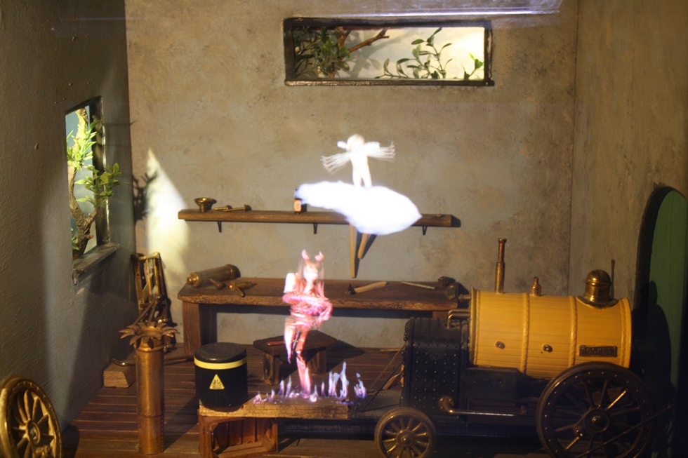 Ich tippe auf eine halbdurchlässige Spiegelfolie in 45°-Stellung mit Projektion von oben oder unten..