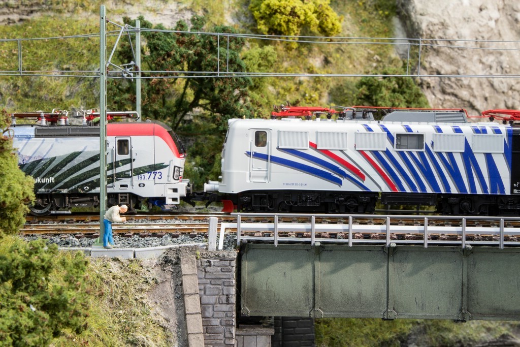 Die Neuheiten in Z sind ja woanders schon öfters gezeigt worden, von mir gibt´s deshalb etwas, was über den Tellerrand raus schaut: Fleischmann/Roco hatte eine neue Messeanlage, die diesmal das Altmühltal nachgebildet hatte. Die Felsen sind vielleicht etwas hell geraten, außerdem war die Betriebssicherheit noch nicht 100%ig gewährleistet, was aber ja durchaus vorbildgerecht sein kann...