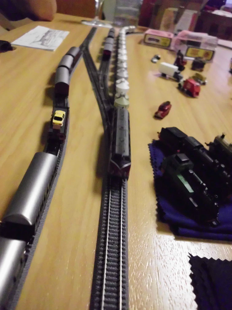 ja, ich war unter anderem auf dem Stammtischtreffen am 12.08.2011 in Mainz-Bretzenheim anwesend. Ausgestattet mit meinen "neuen" MTL-Gleisen baute ich meinen Rangschiebereich auf und ergänzte die Kurven des Starterkreises von MTL. Genialerweise hatte Manfred ebenfalls Schienen dabei und ergänzte die Gegengerade. Somit hatten wir mit wenigen Griffen einen funktionsfähigen Fahrbetrieb gezaubert mit Abstellmöglichkeit aller erdenklichen nicht motorisierten Rollmaterials.