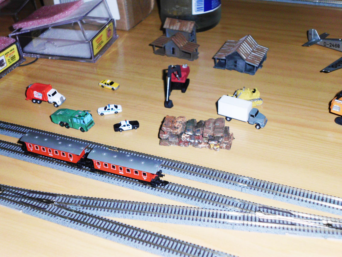 Auch Jürgen stieß zu der Truppe und brachte detailierte Fahrzeuge aus Amerika mit. Polizeifahrzeuge, einen Müllwagen, Transporter und ein klasse New York Taxi in 1:220. Unter anderem einen Schrottplatz und zwei interessante Fertiggebäude in used look.