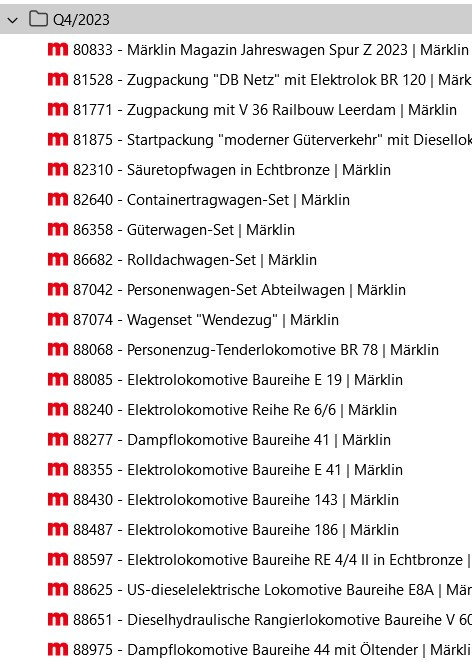 Was da wieder viel in Q4 kommen soll. Gerade vor Weihnachten bringt Märklin im Oktober und November doch alljährlich verstärkt H0 Modelle für das Weihnachtsgeschäft.