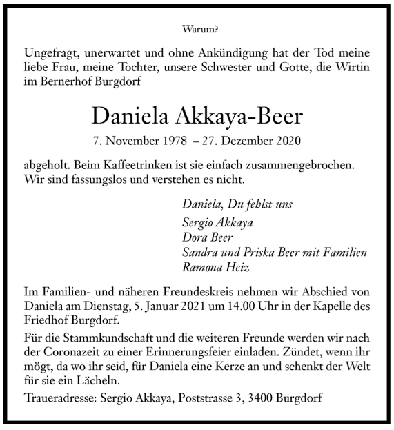 In der Altjahreswoche ist unsere geschätzte Wirtin Daniela von uns gegangen.