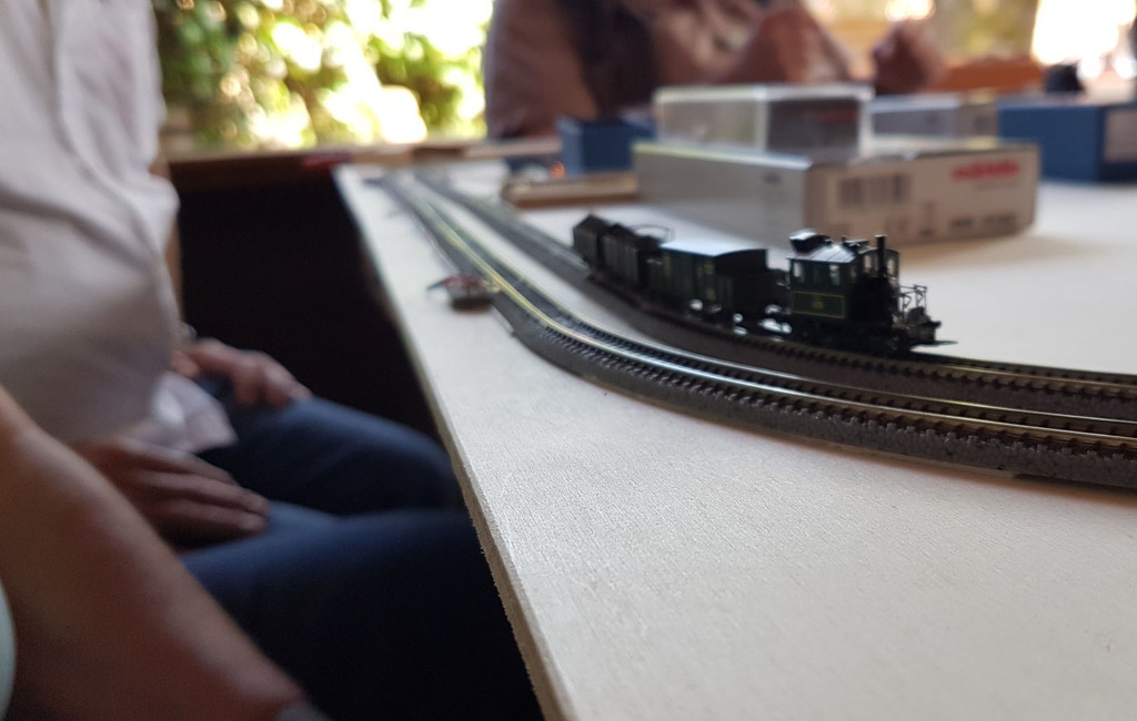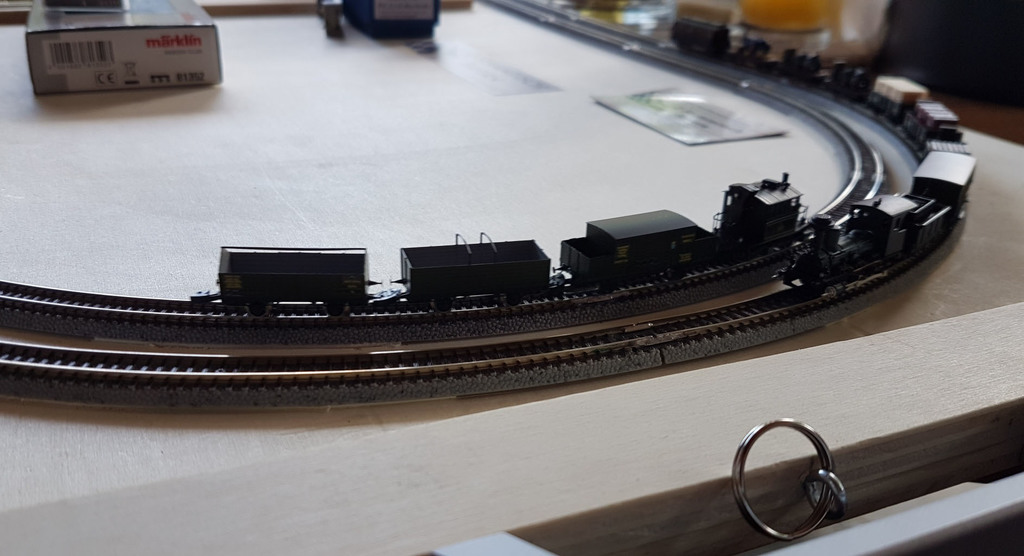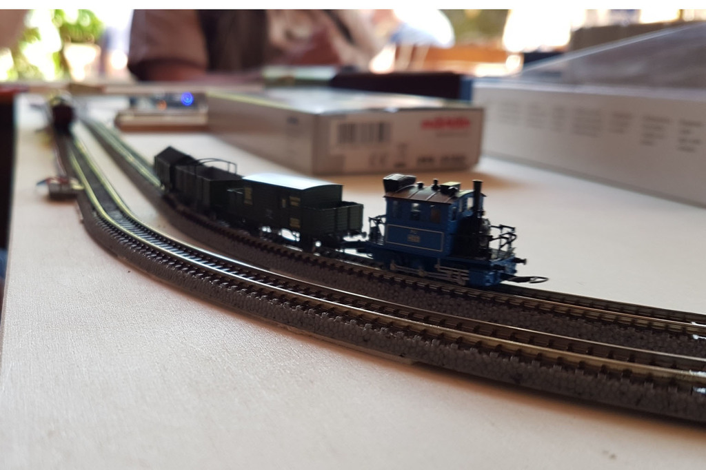 Es war wirklich sehr nett und kurzweilig. Auf Grund des schönen Wetters saßen wir draußen. Es wurde gefachsimpelt und fotografiert. Ich konnte den Kittel in seiner gleichmäßien Fahrt bewundern, und das gleich auf zwei Testgleisen zeitgleich! Ein grüner und ein blauer! Glaskasten zogen abwechselnd die bayerische Fracht. Auch die BR80 war mit dem Kohlenzug unterwegs. Alle waren sich einig, dass Märklin da sehr schöne Modelle produziert hat.