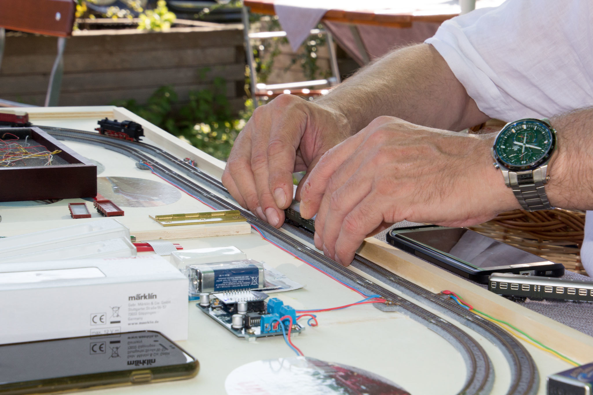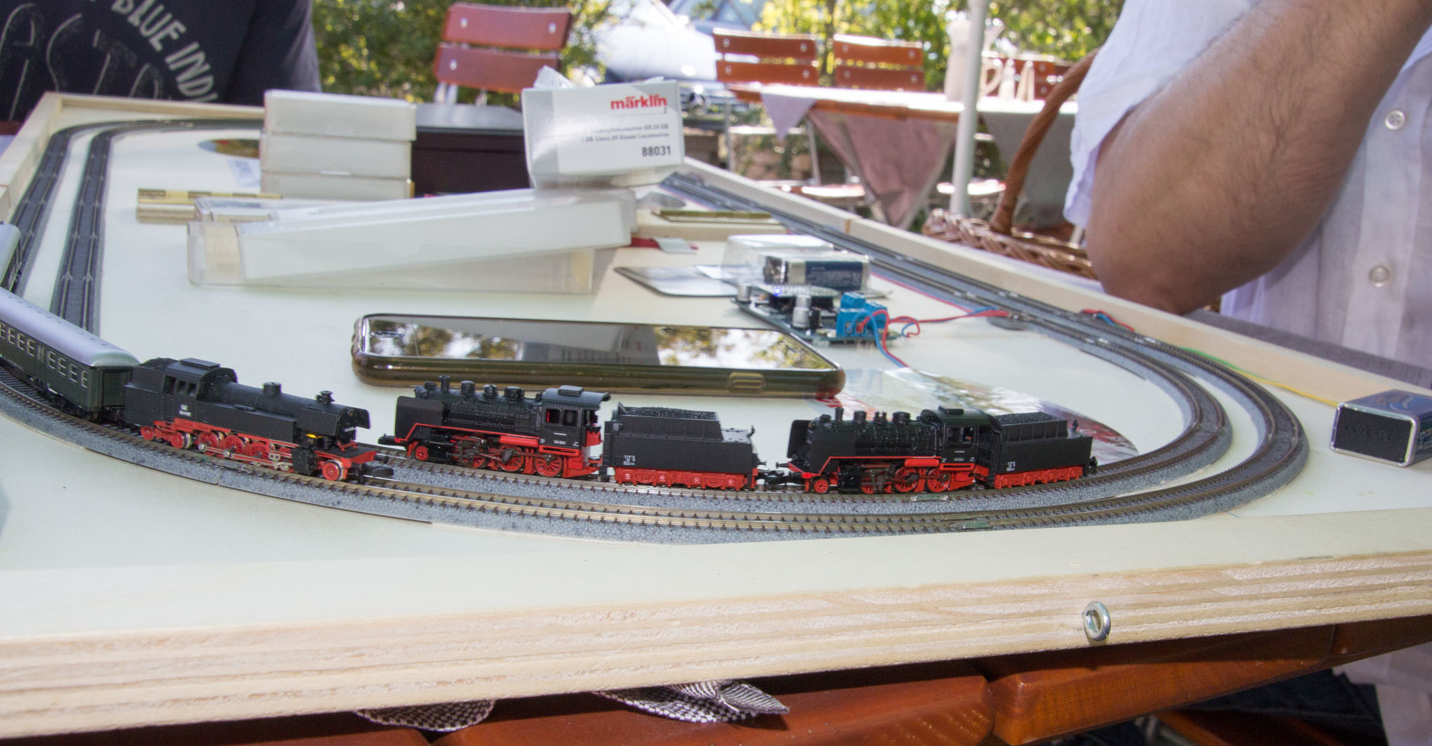 Nachdem wir den halben Biergarten ins Chaos gestürzt haben durfte Hagen dann an einem Tisch sein Testoval aufbauen, auf dem einige seiner Umbauten ihre Runden gezogen haben.